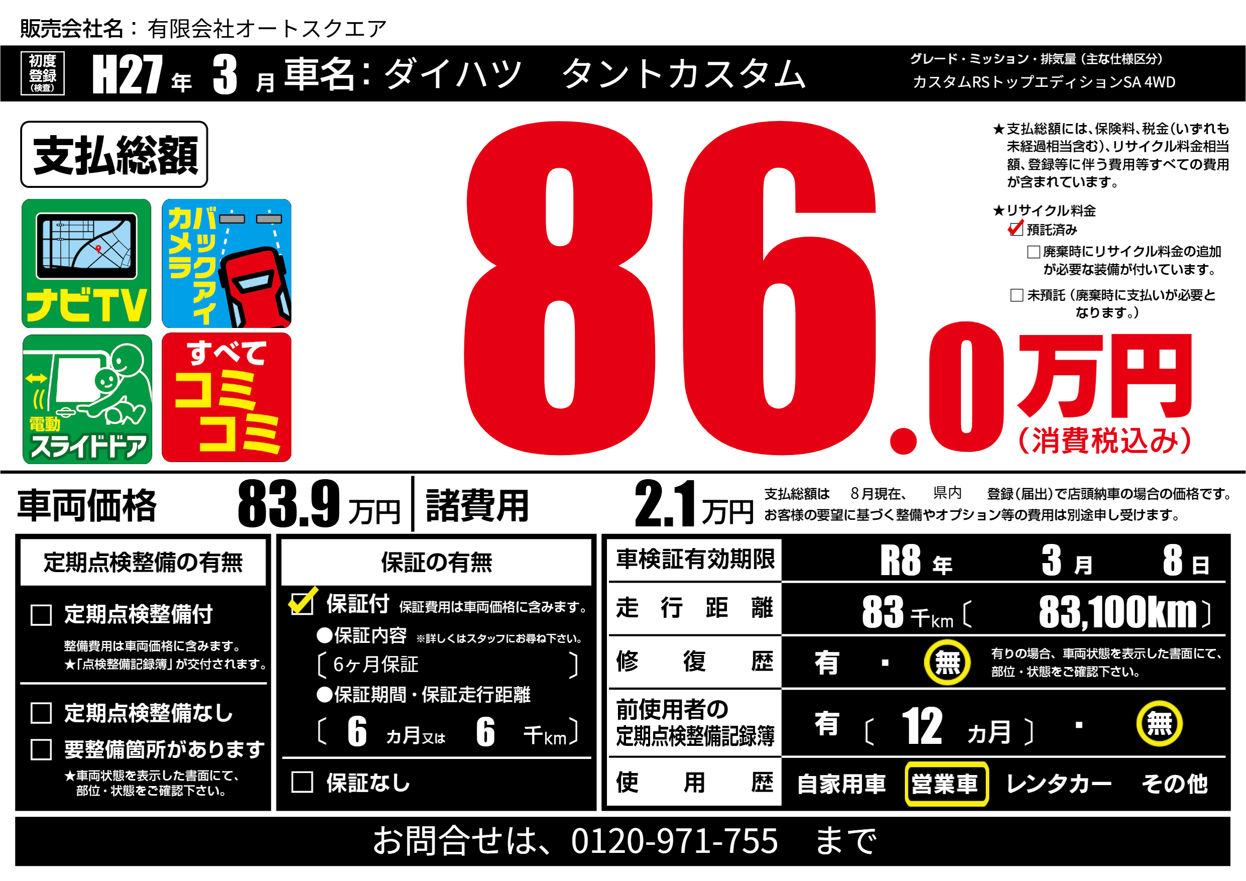 | 走行キロ | 8.3万km | 初年度登録 | H27年3月 |