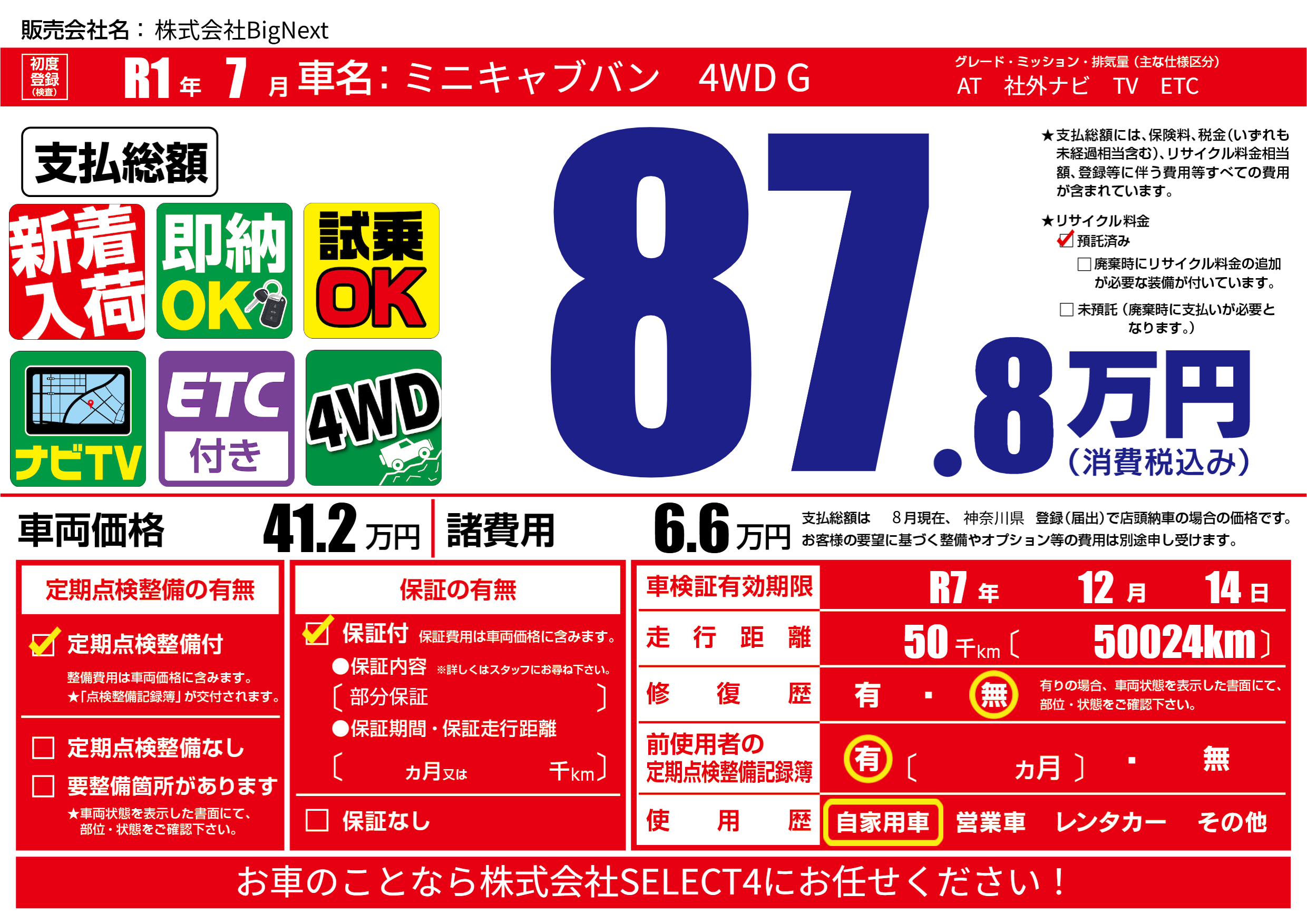 | 走行キロ | 5万km | 初年度登録 | R1年7月 |