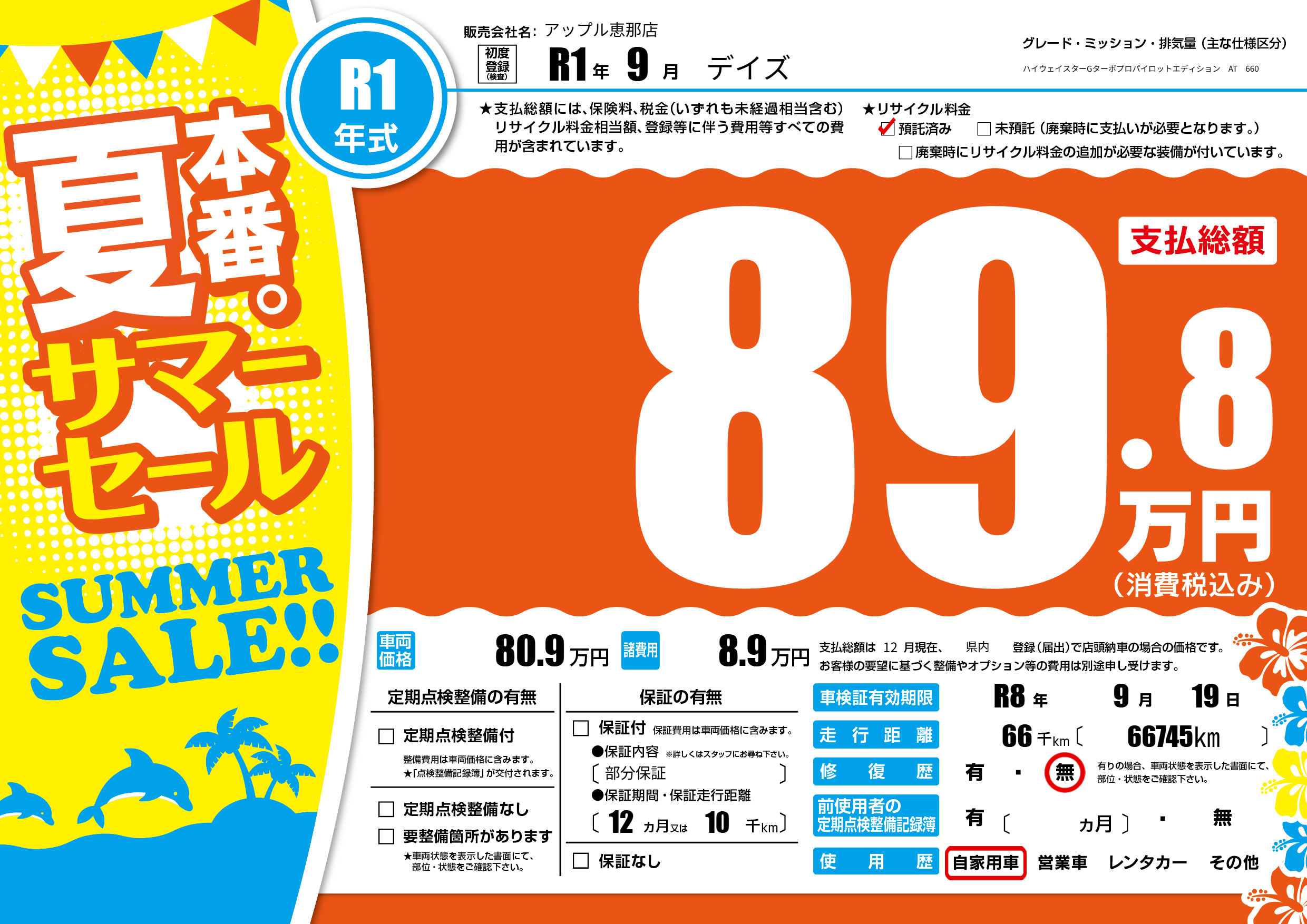 なし | 車検制限 | R8年9月19月 |