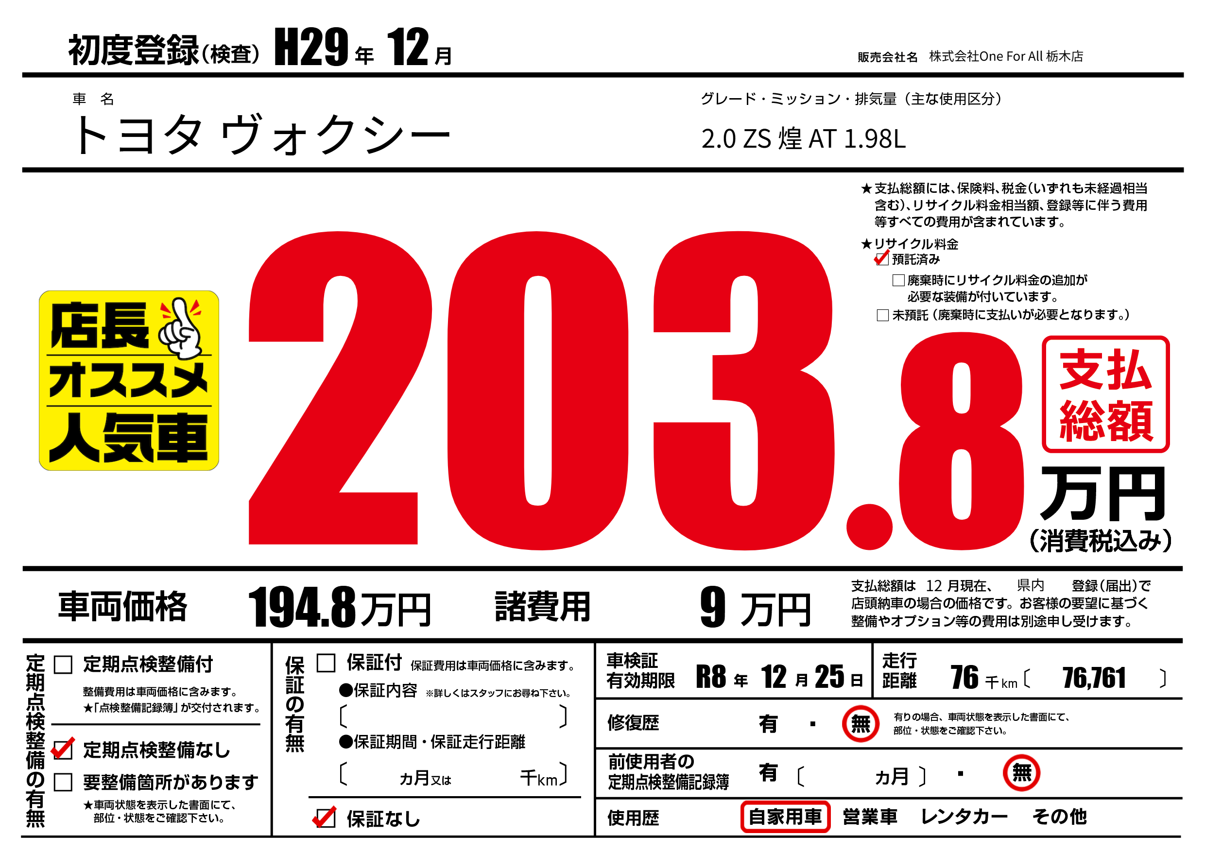 | 車名 | トヨタ ヴォクシー | グレード ミッション 排気量 |