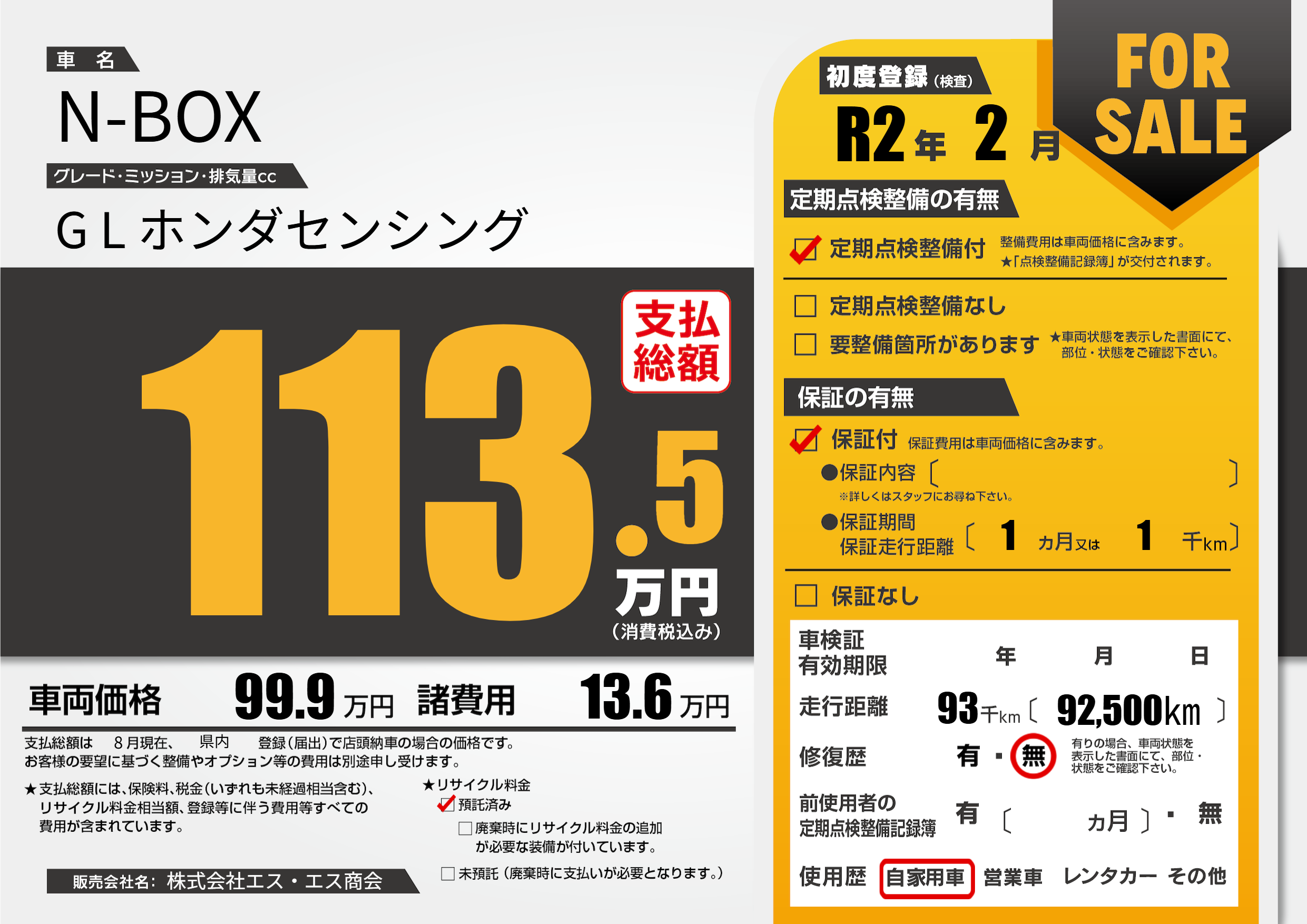 | 走行キロ | 9.3万km | 初年度登録 | R2年2月 |