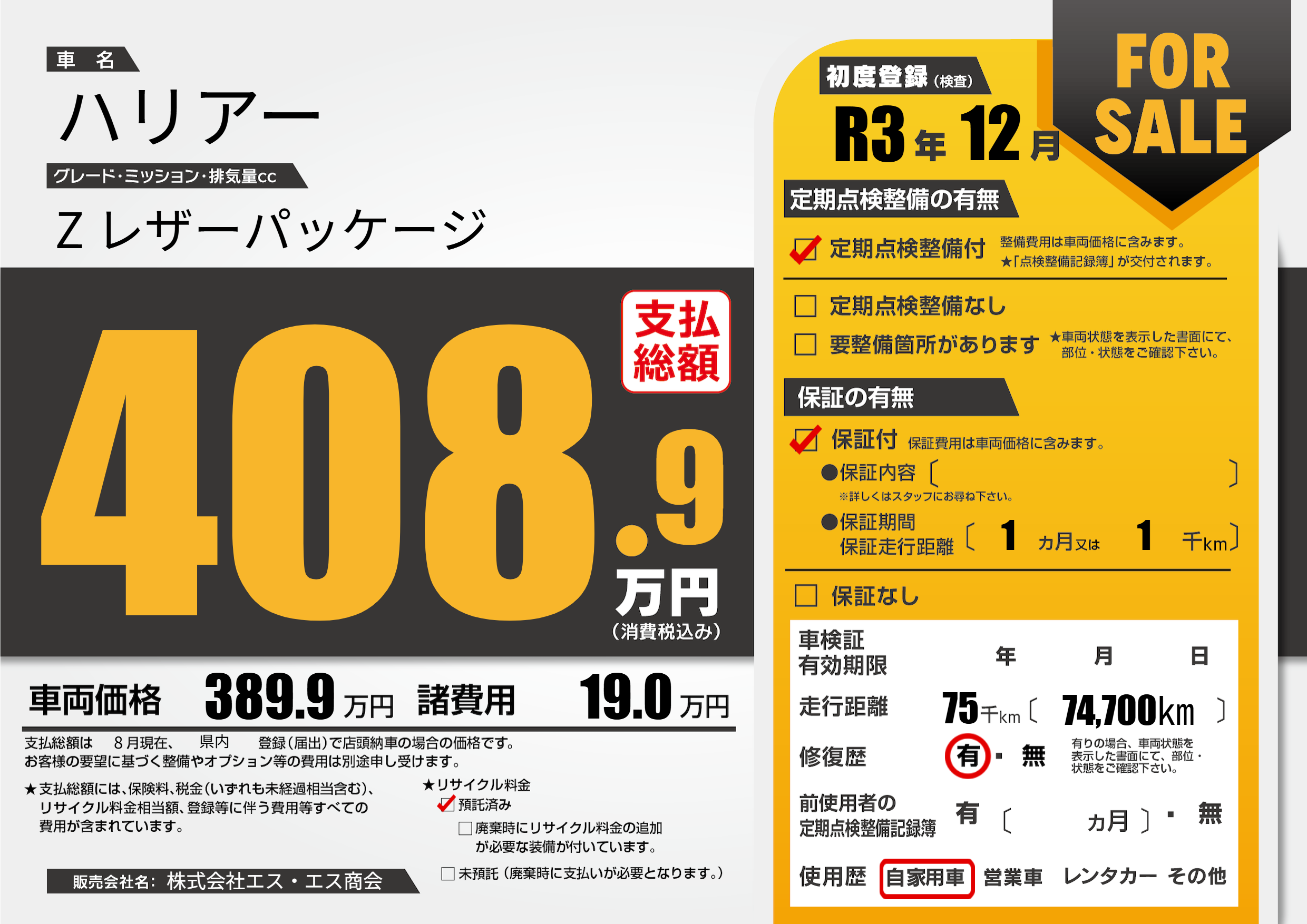 | 走行キロ | 7.5万km | 初年度登録 | R3年12月 |