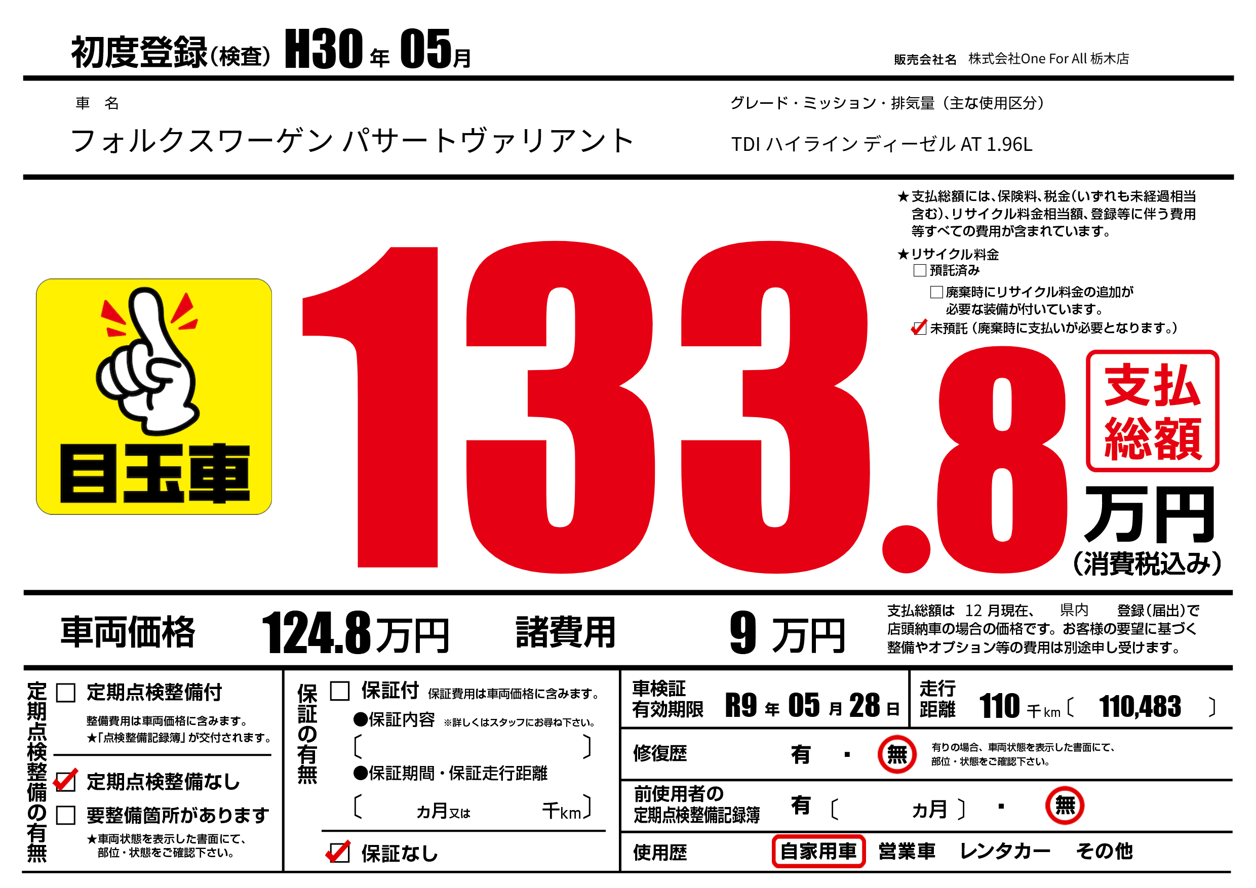| 車名 | フォルクスワーゲン パサートヴァリアント | グレード ミッション 排気量 |
