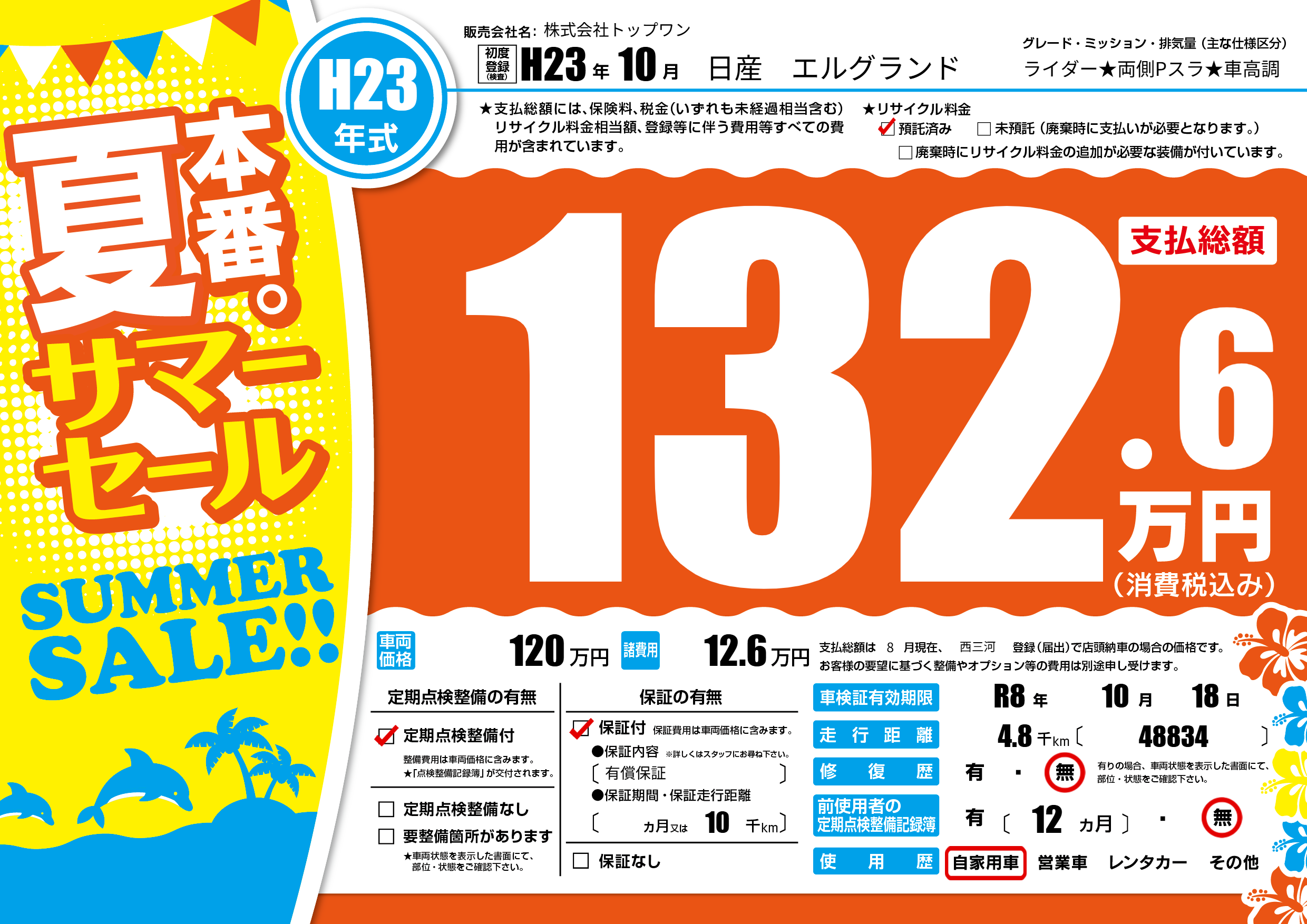 | 走行キロ | 0.4万km | 初年度登録 | H23年10月 |