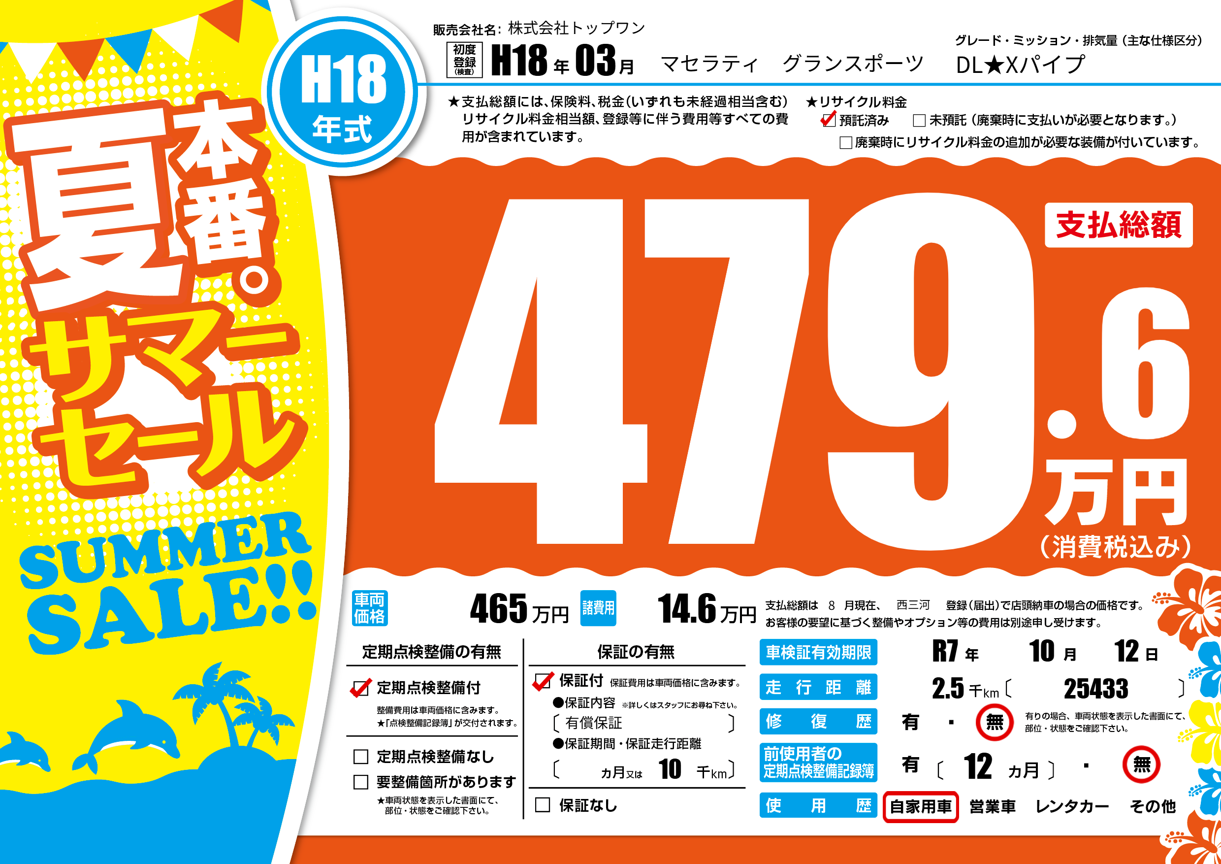 | 走行キロ | 0.2万km | 初年度登録 | H18年03月 |