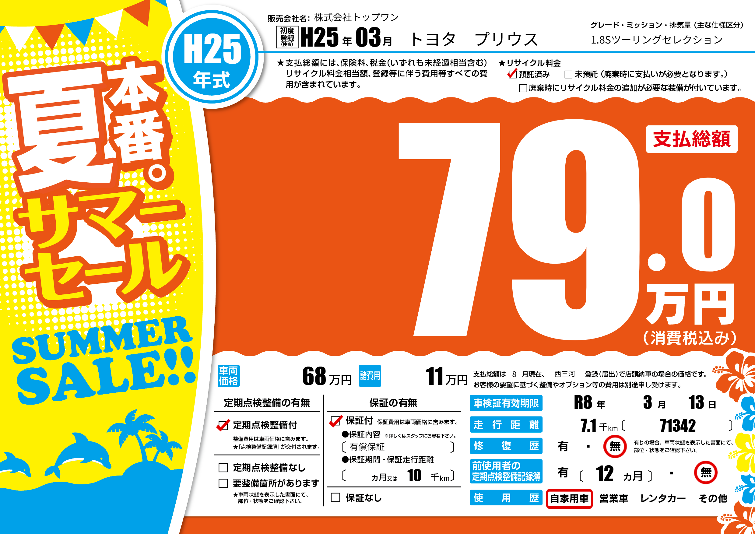| 走行キロ | 0.7万km | 初年度登録 | H25年03月 |