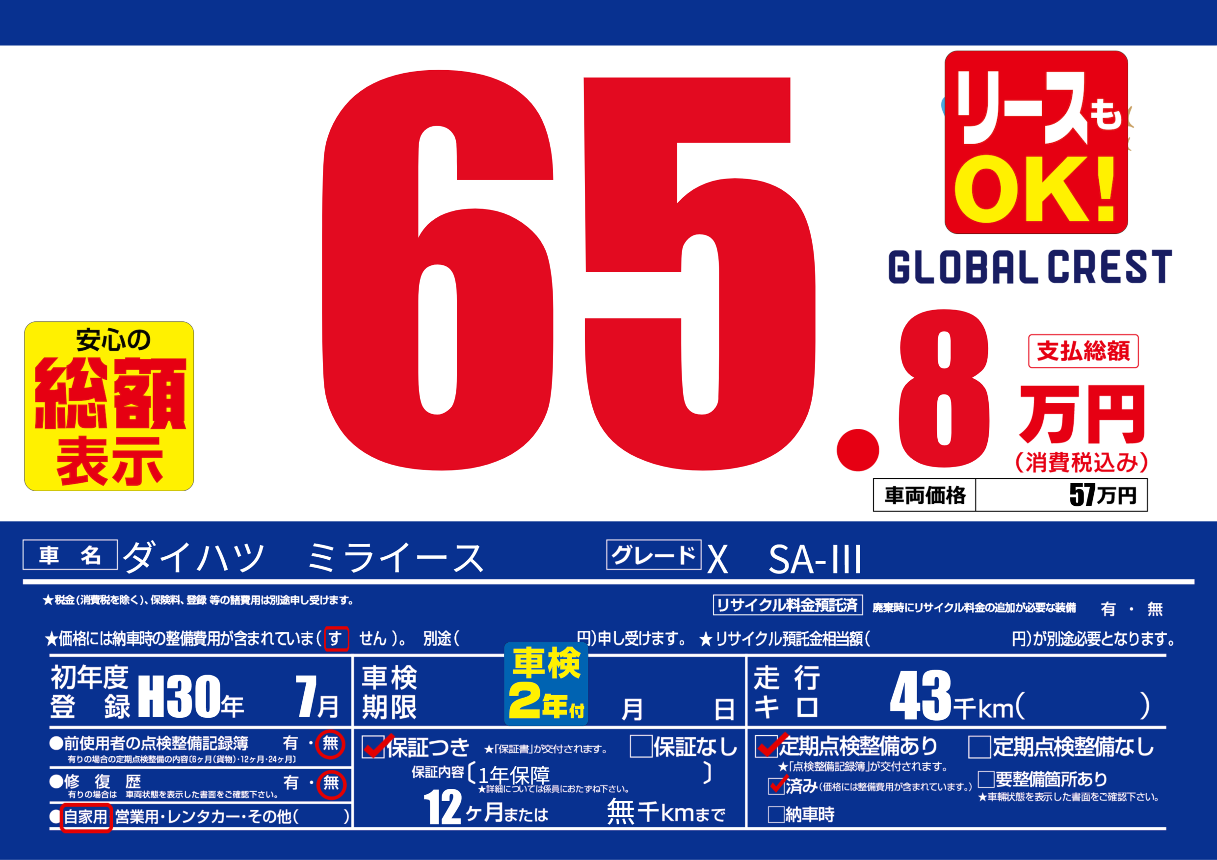 | 走行キロ | 4.3万km | 初年度登録 | H30年7月 |