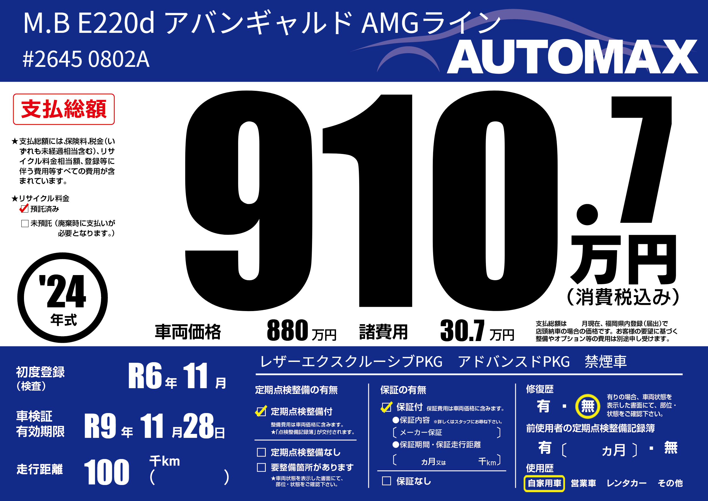 | 車名 | M.B E220d アバンギャルド AMGライン | グレード ミッション 排気量 |