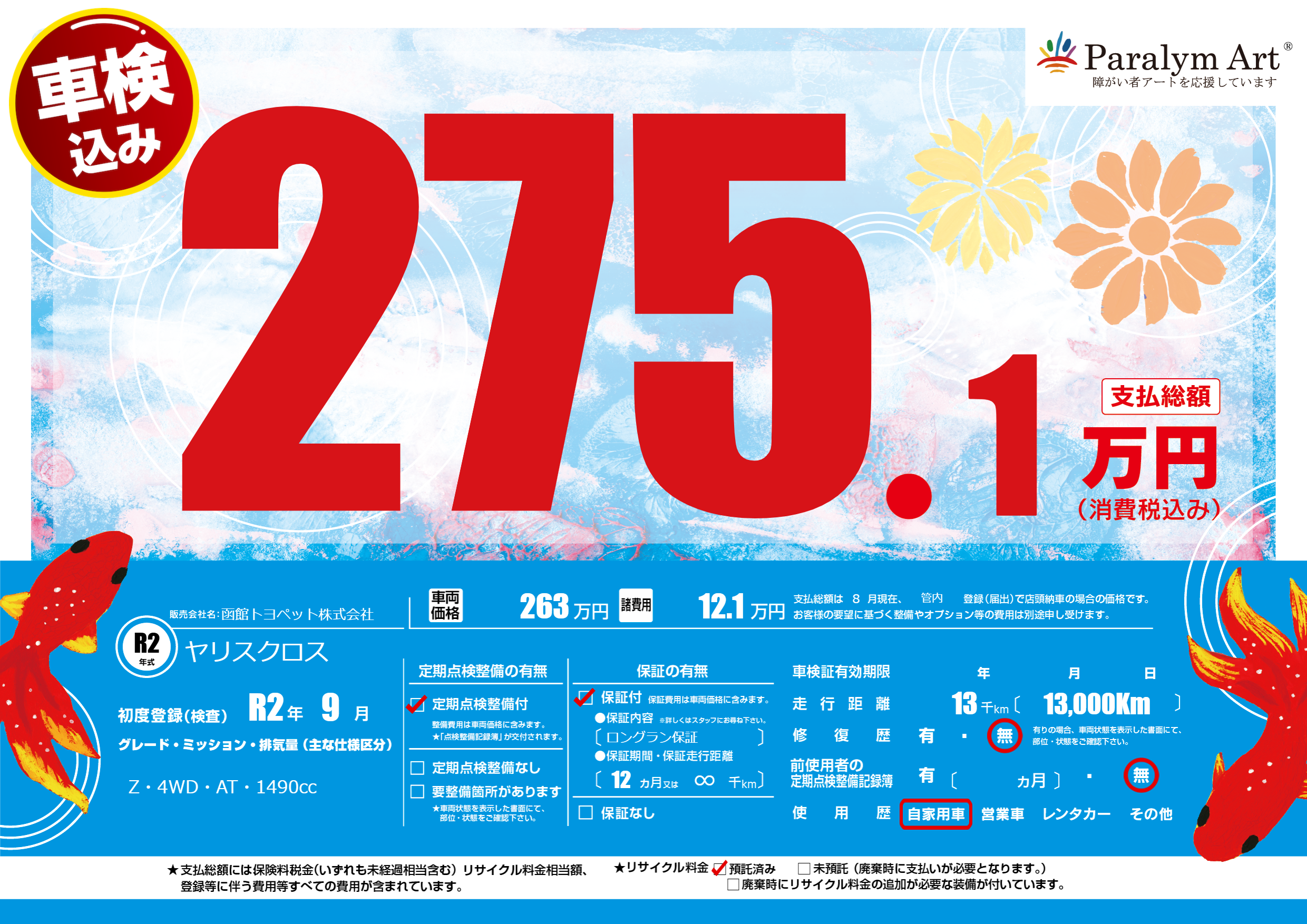 | 走行キロ | 1.3万km | 初年度登録 | R2年9月 |