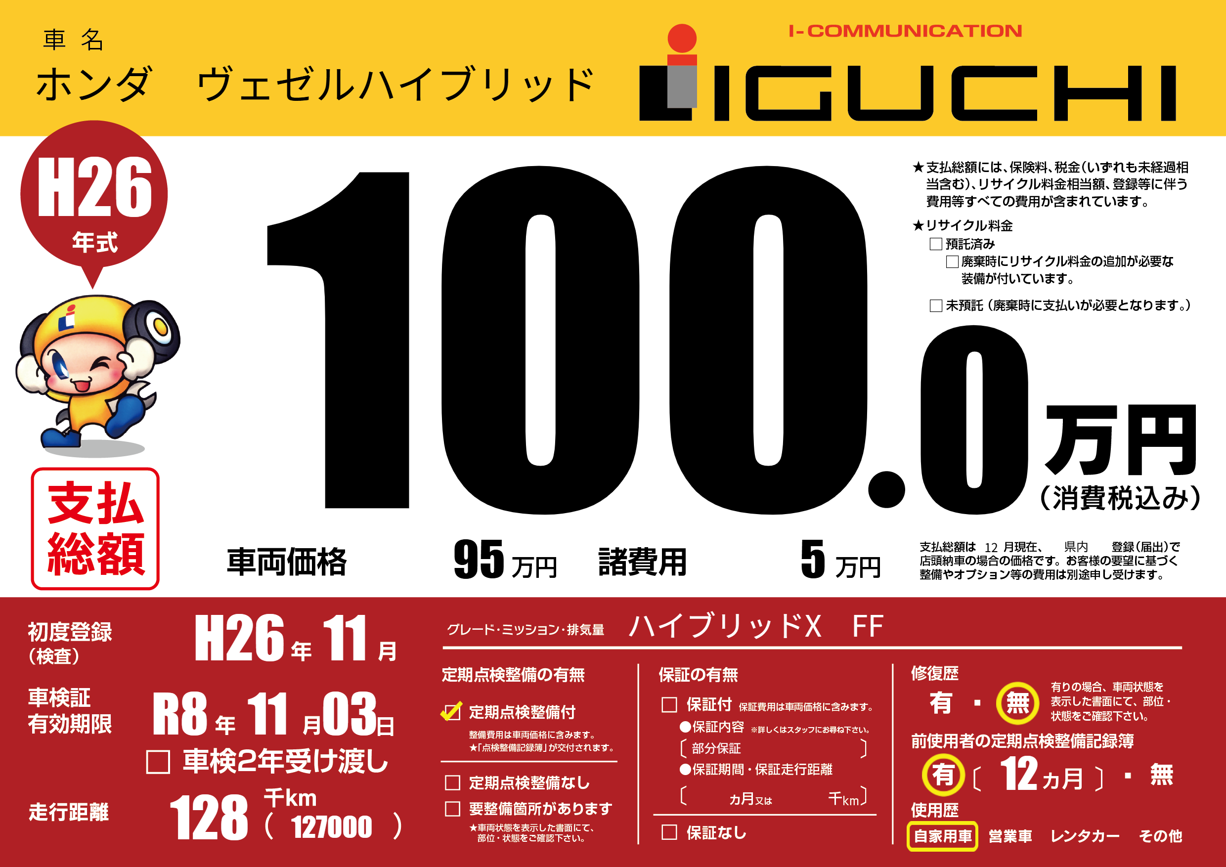 | 走行キロ | 12.8万km | 初年度登録 | H26年11月 |