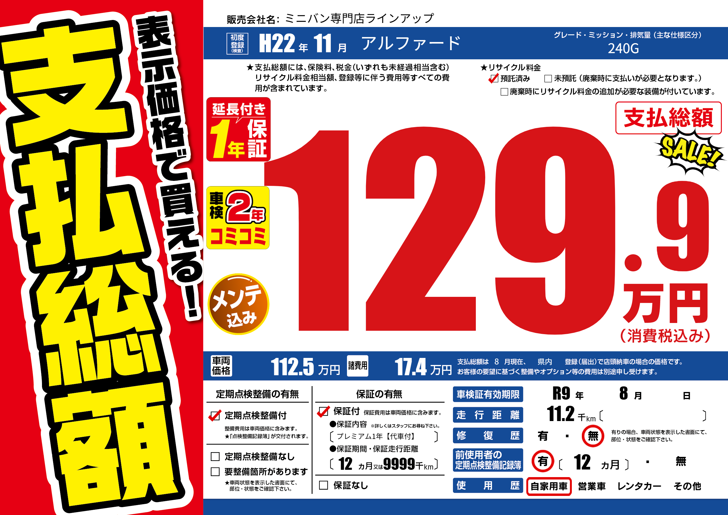 | 車名 | アルファード | グレード ミッション 排気量 |
