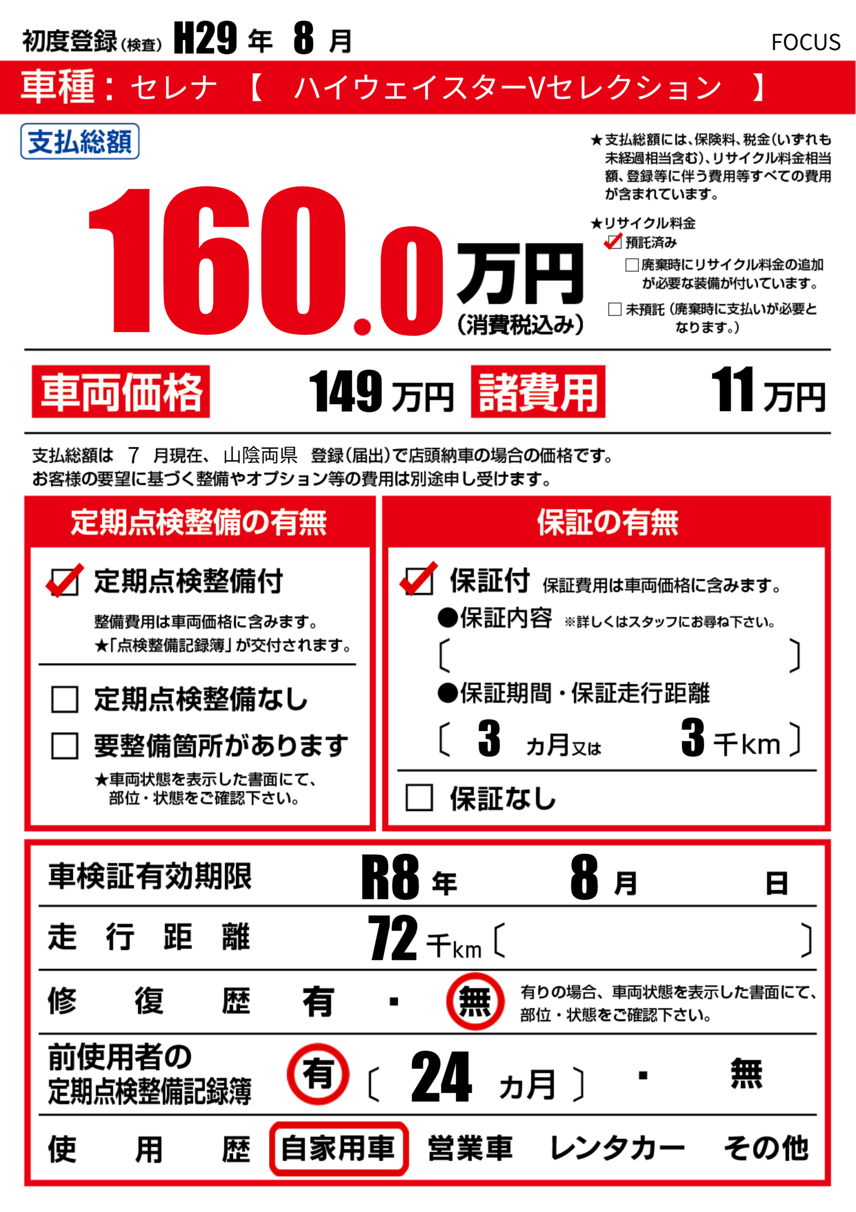 | 車検制限 | R8年 8月 - 日 | ||