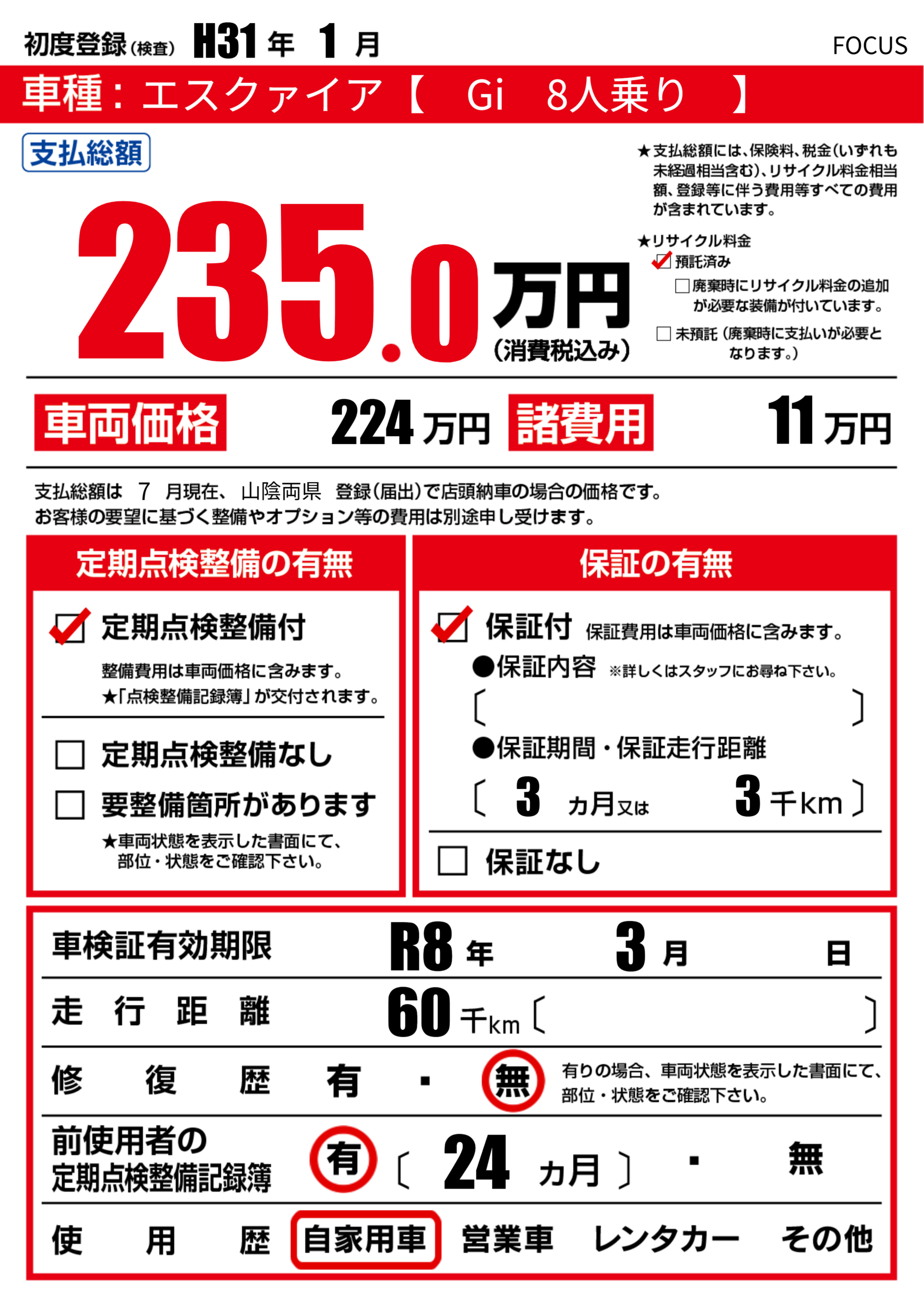 | 走行キロ | 6万km | 初年度登録 | H31年1月 |