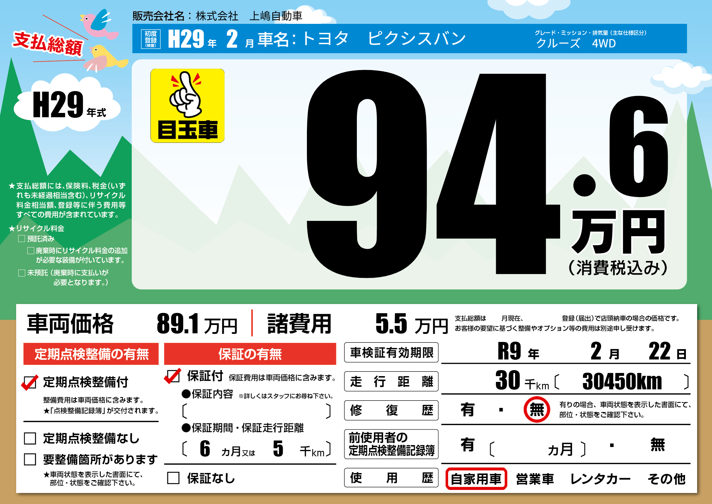 | 走行キロ | 3万km | 初年度登録 | H29年2月 |