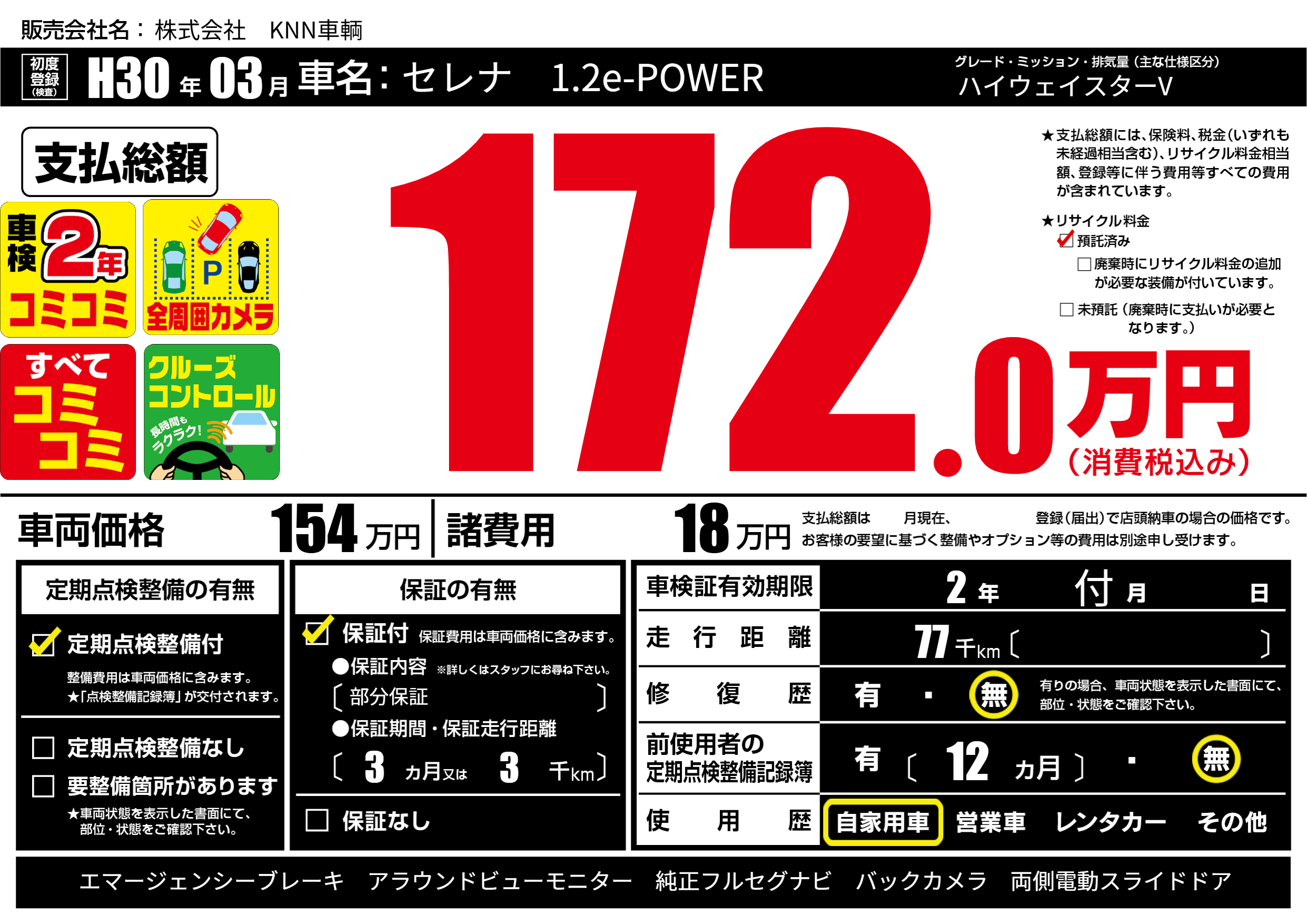 | 車名 | セレナ 1.2e-POWER | グレード ミッション 排気量 |