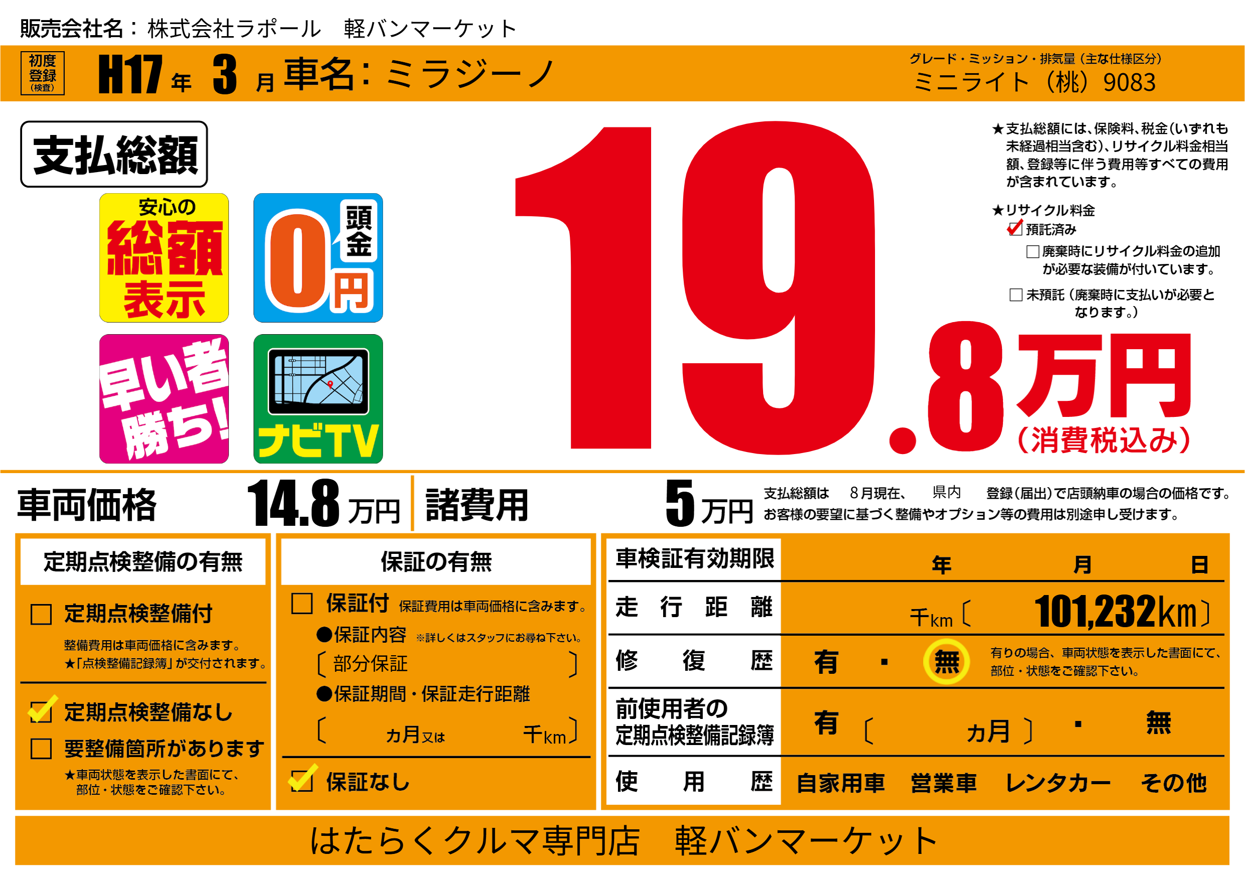 | 車名 | ミラジーノ | グレード ミッション 排気量 |