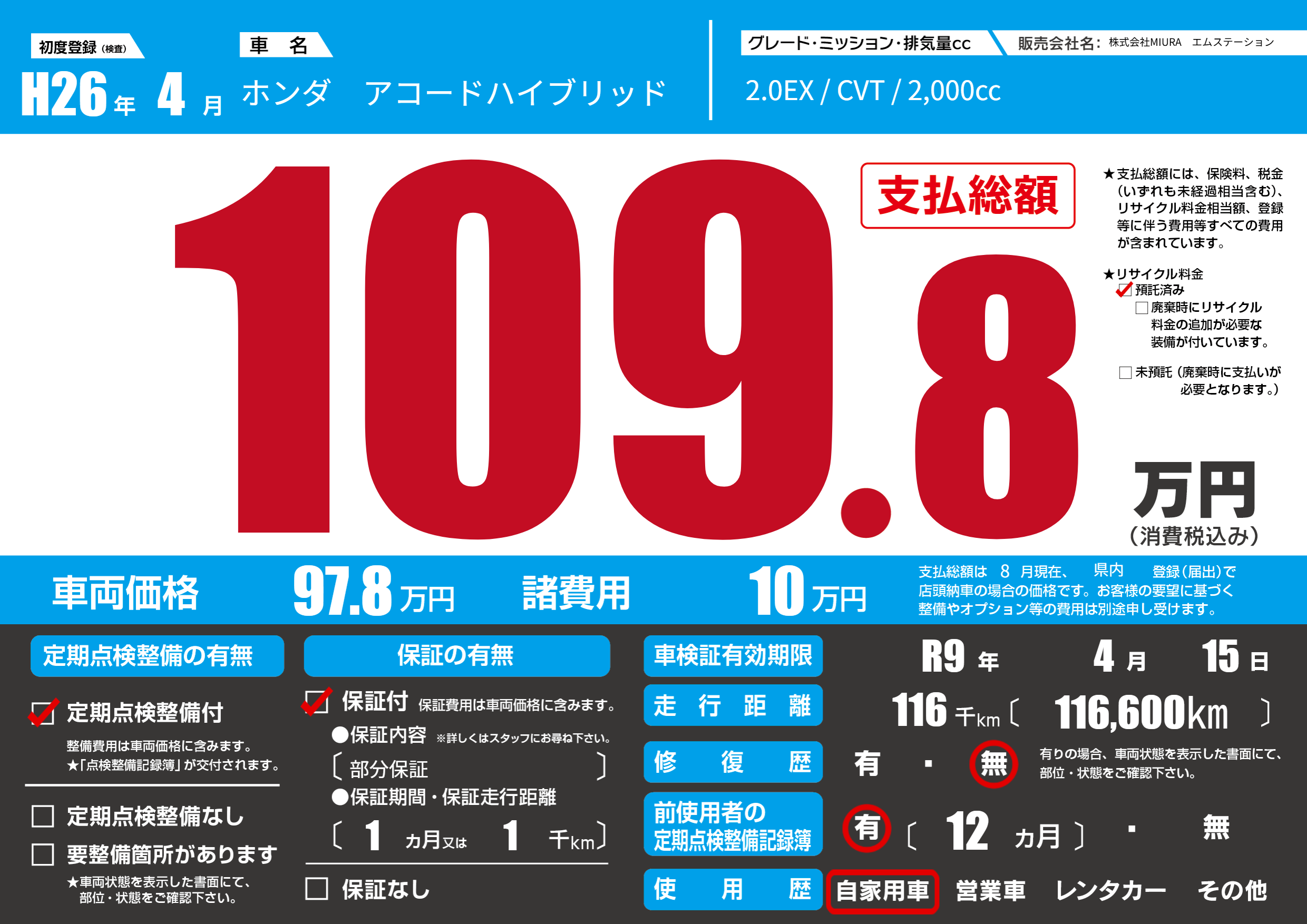 | 走行キロ | 11.6万km | 初年度登録 | H26年4月 |