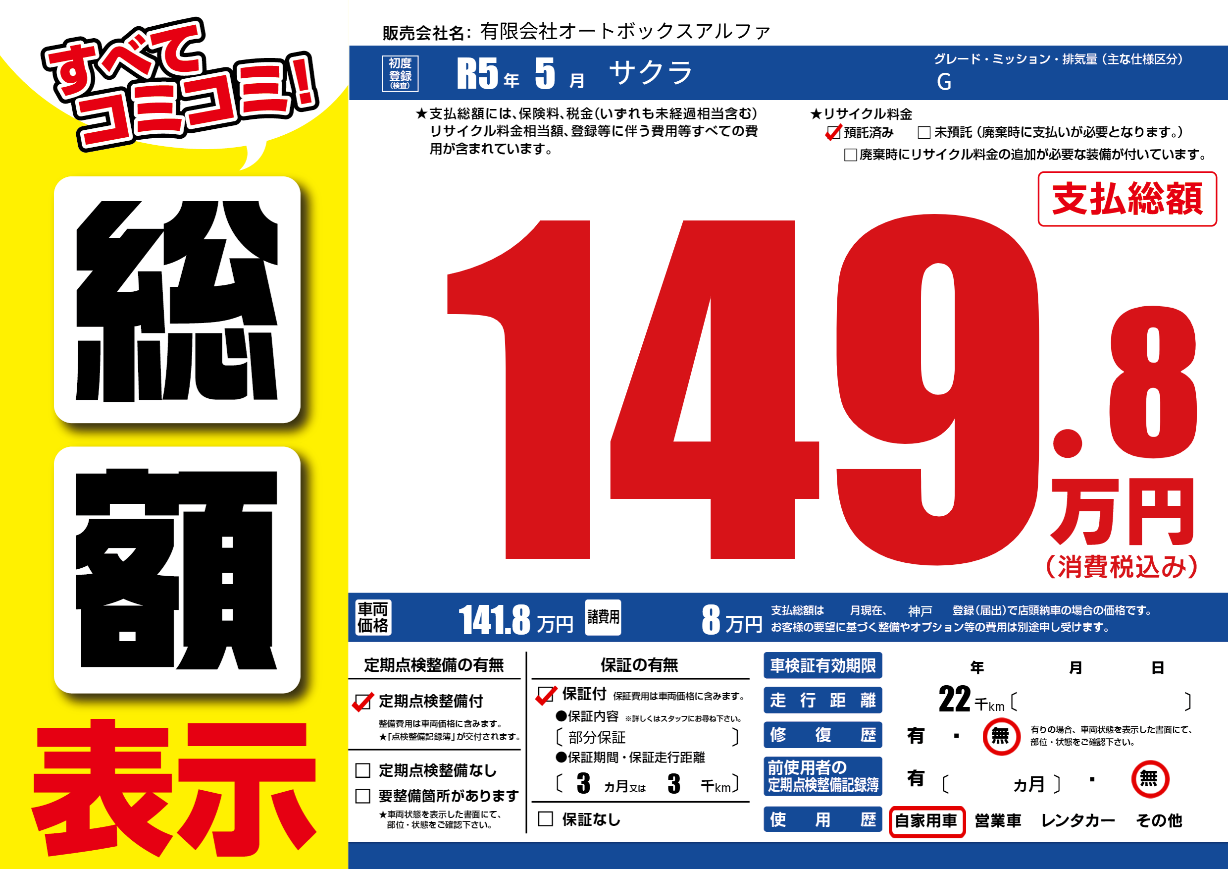 | 車名 | サクラ | グレード ミッション 排気量 |