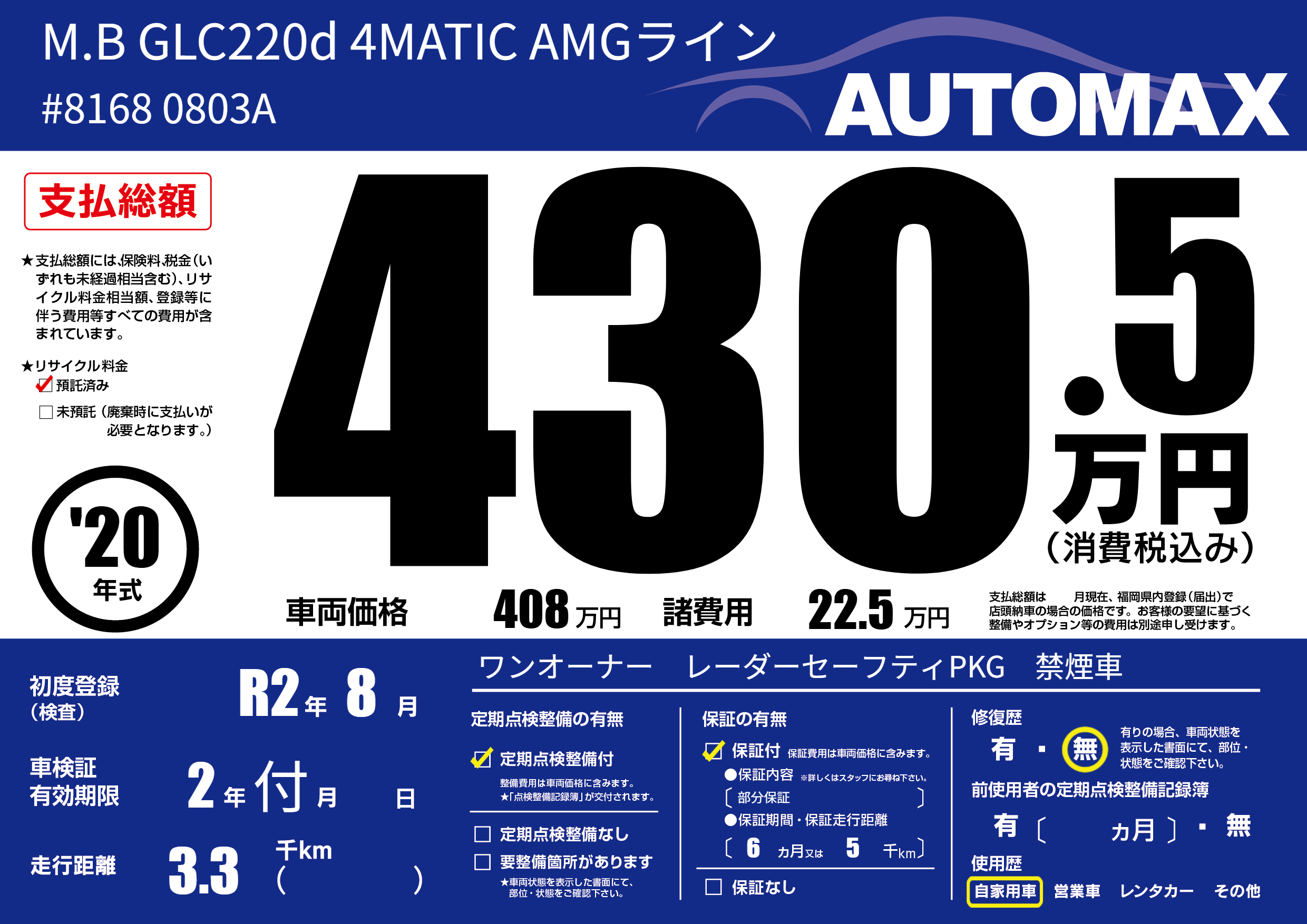 | 車名 | M.B GLC220d 4MATIC AMGライン | グレード ミッション 排気量 |