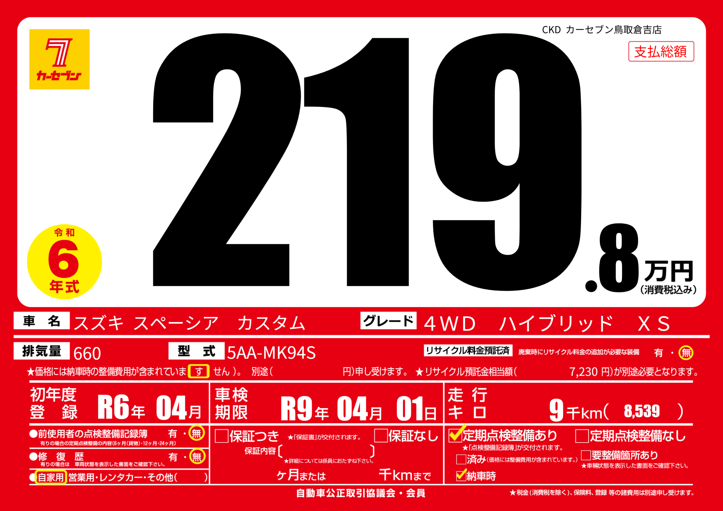 | 走行キロ | 0.9万km | 初年度登録 | R6年04月 |
