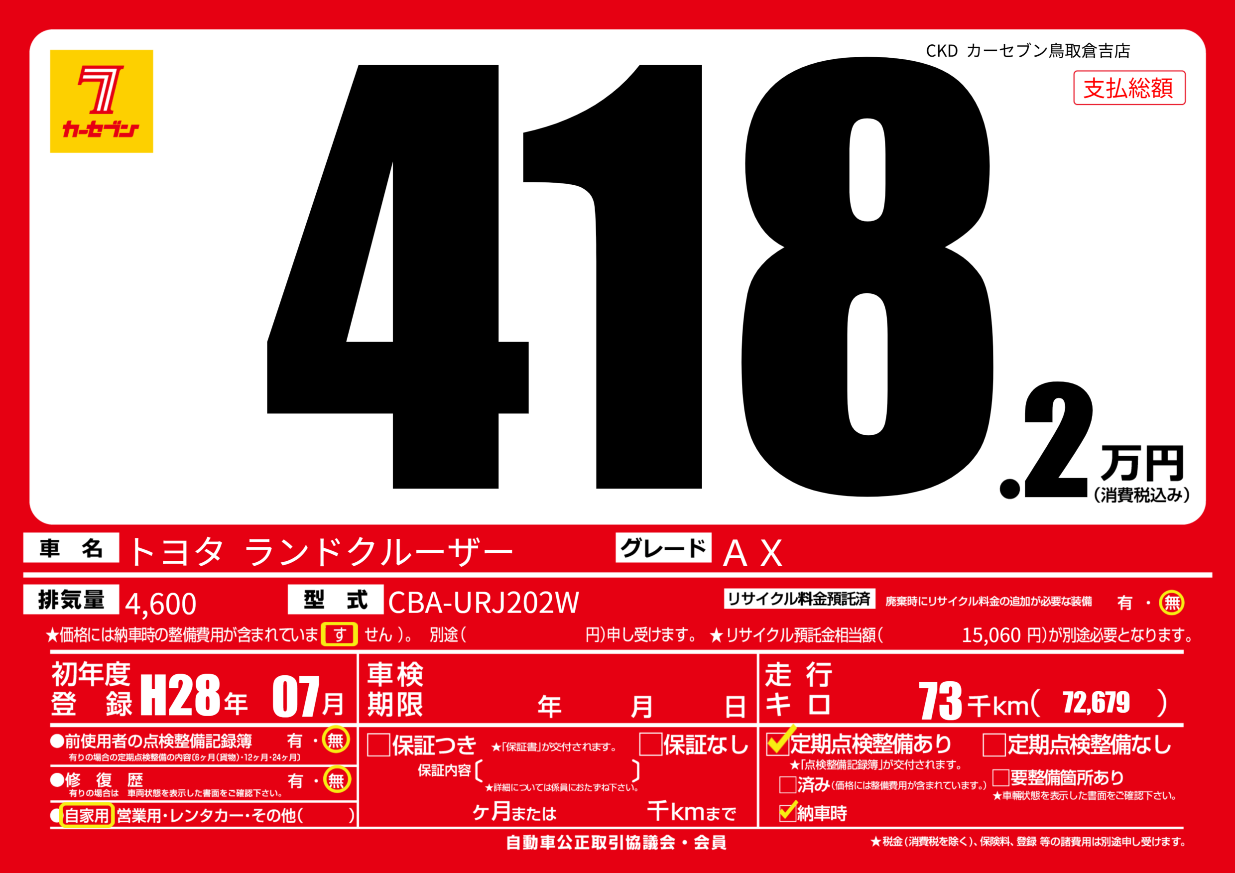 | 定期点検整備 | 定期点検整備あり 納車時あり | ||