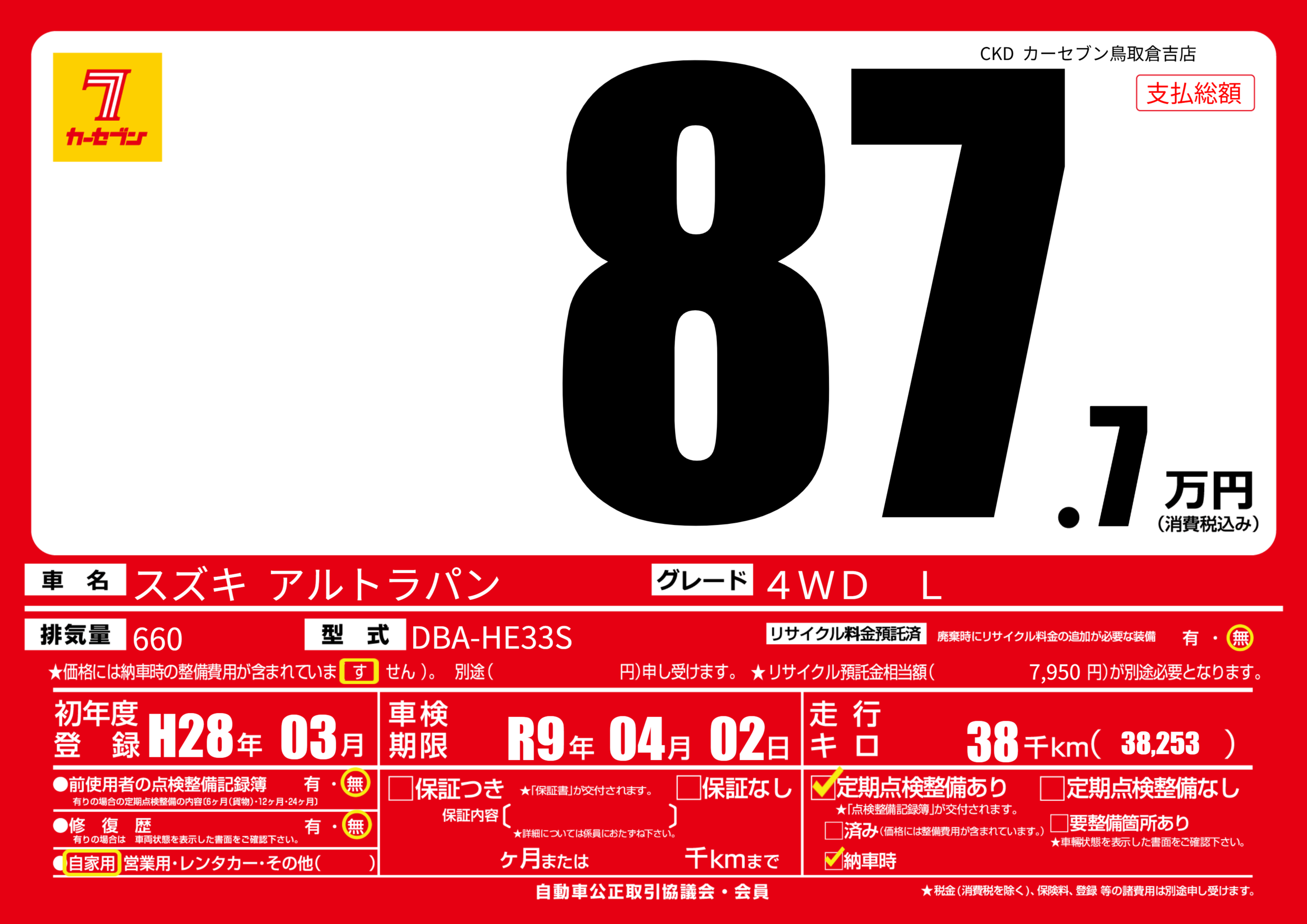 | 定期点検整備 | 定期点検整備あり 納車時あり | ||