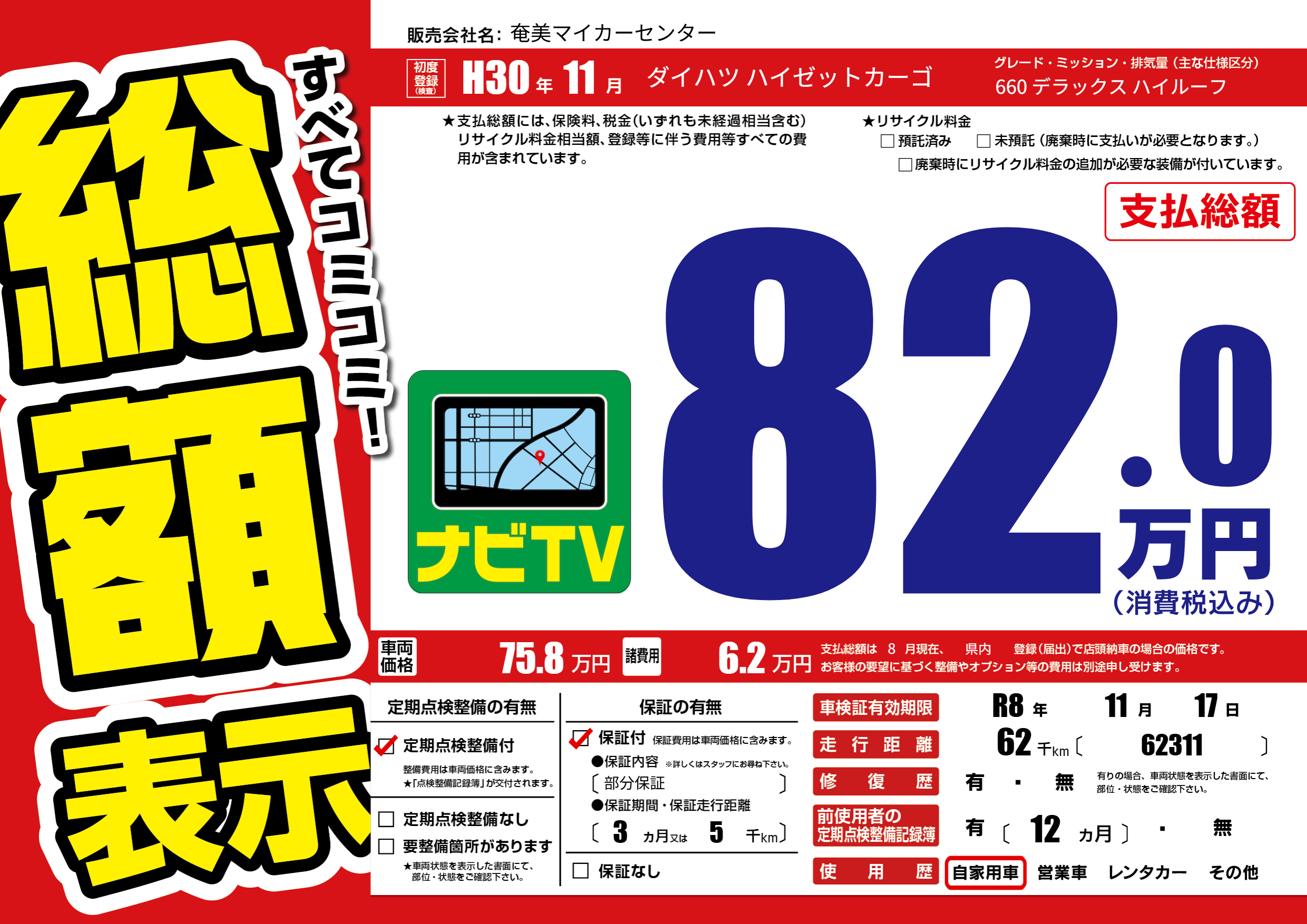 | 走行キロ | 6.2万km | 初年度登録 | H30年11月 |