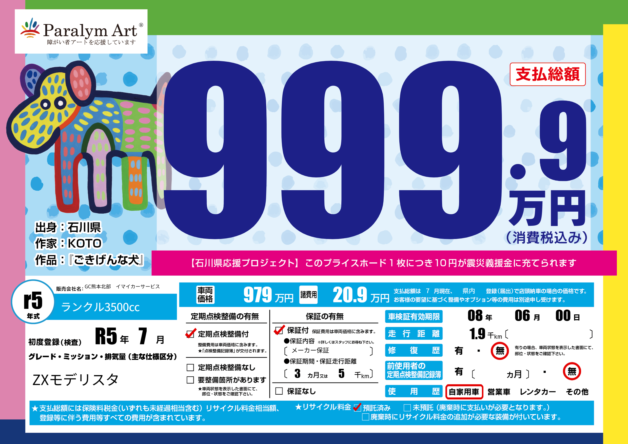 | 走行キロ | 0.1万km | 初年度登録 | R5年7月 |