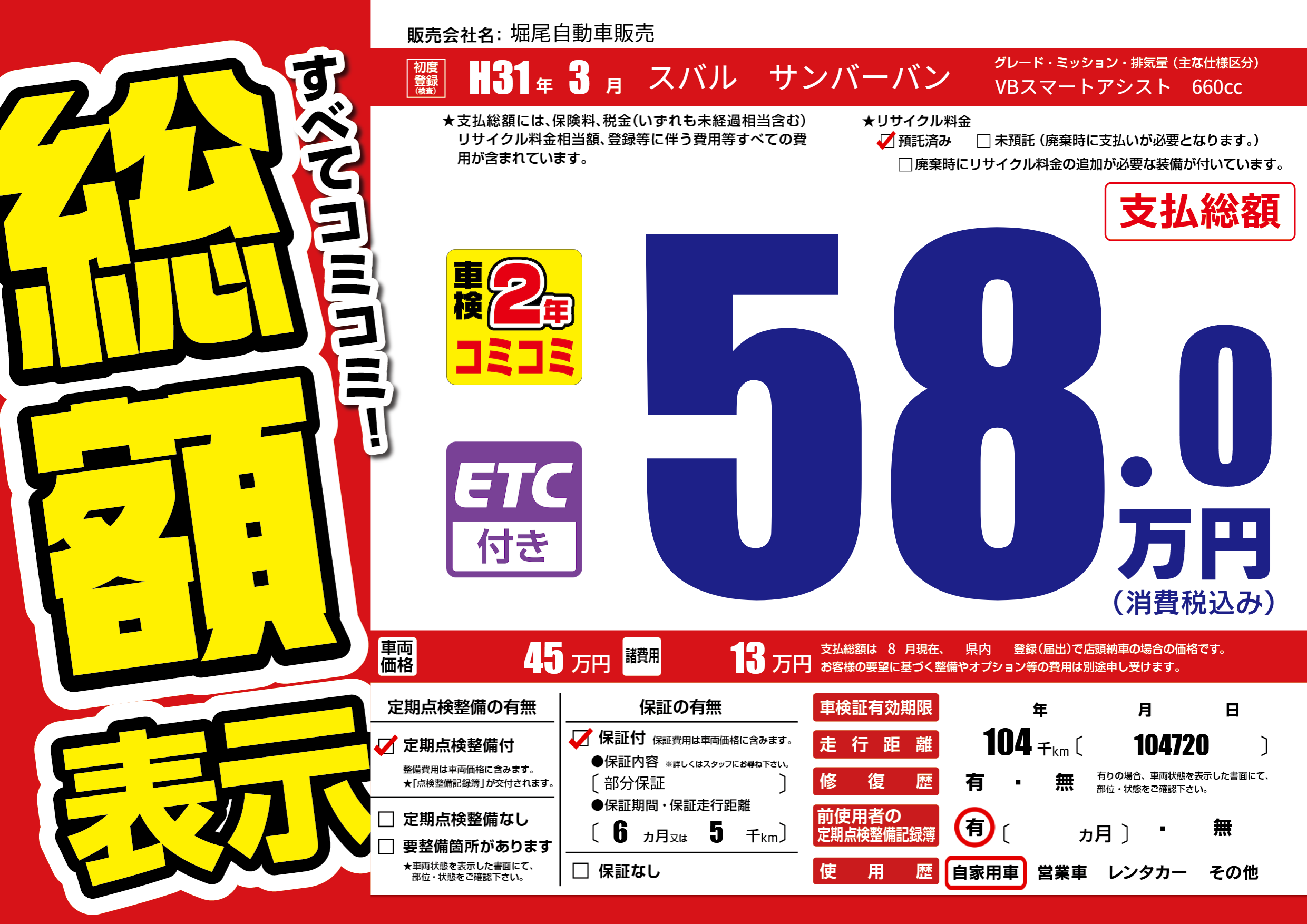 | 走行キロ | 10.4万km | 初年度登録 | H31年3月 |