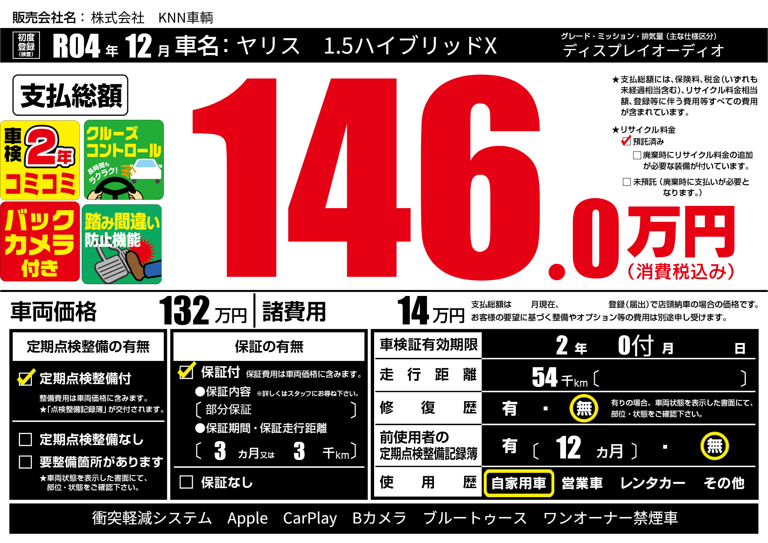 | 車名 | ヤリス 1.5ハイブリッドX | グレード ミッション 排気量 |