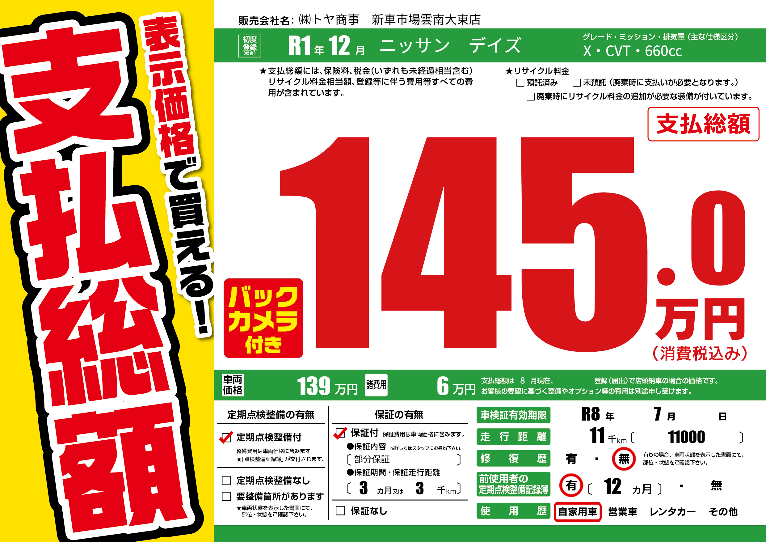 なし | 車検制限 | R8年7月---月 |
