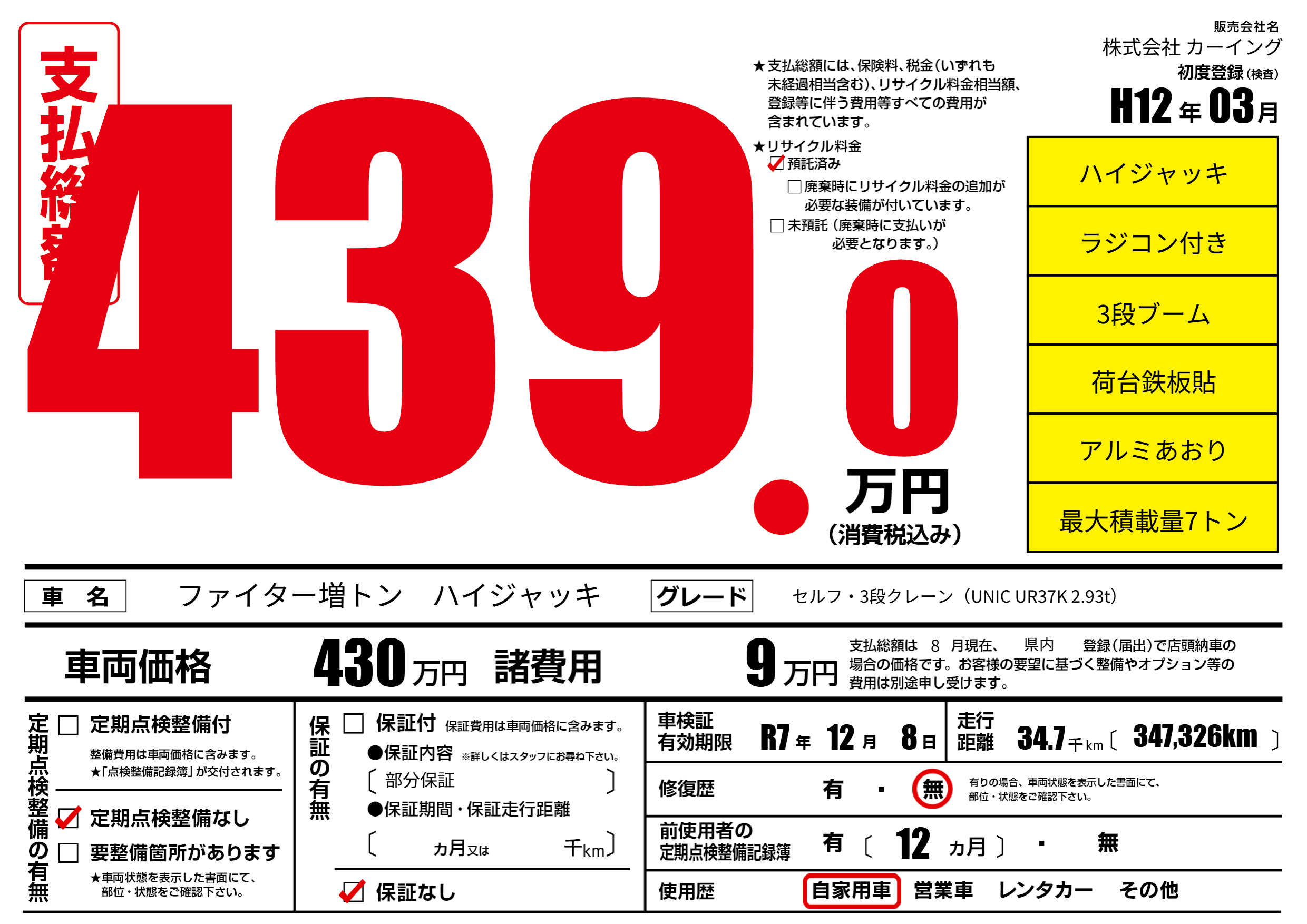 | 車名 | ファイター増トン ハイジャッキ | グレード ミッション 排気量 |