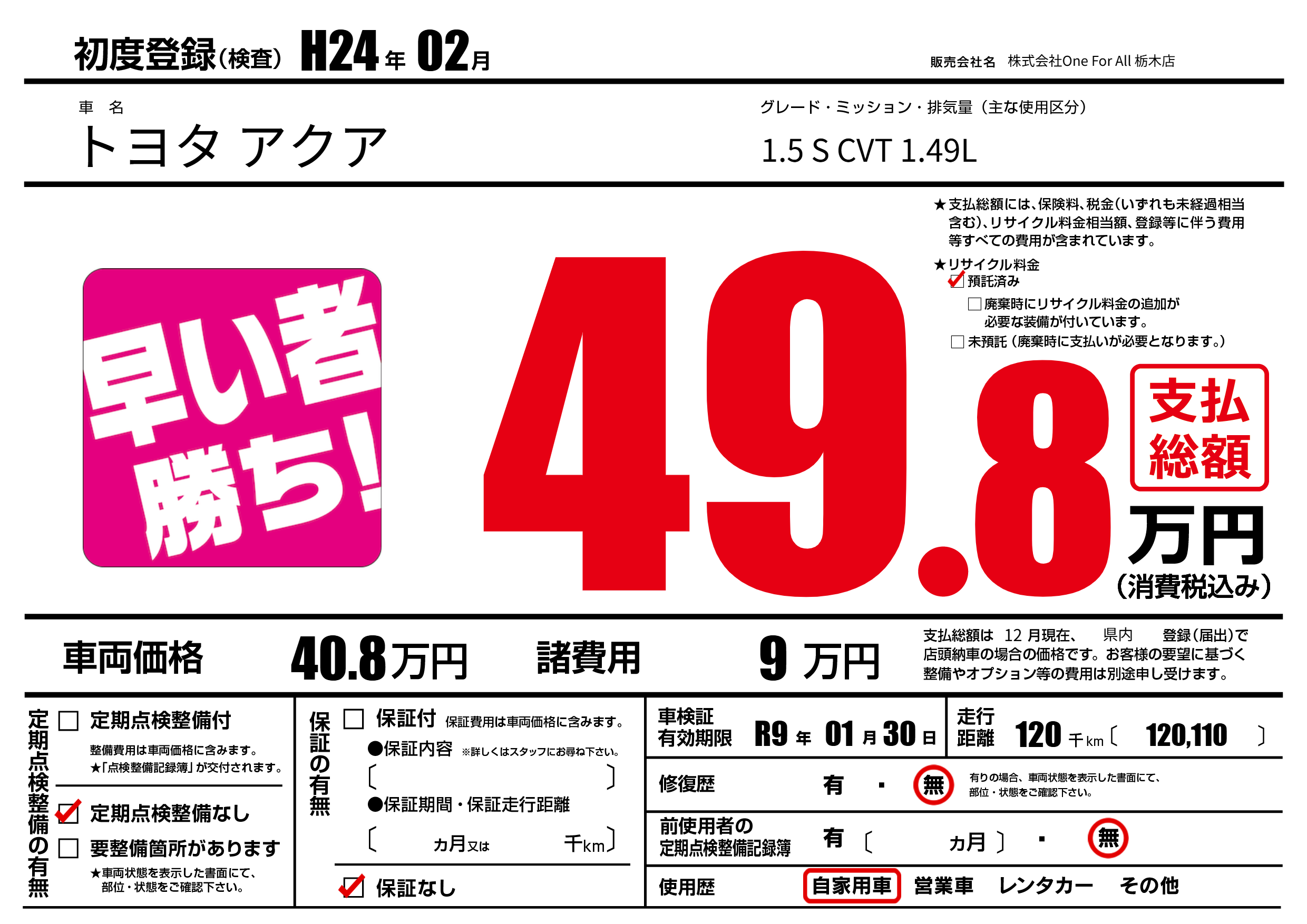 | 車名 | トヨタ アクア | グレード ミッション 排気量 |