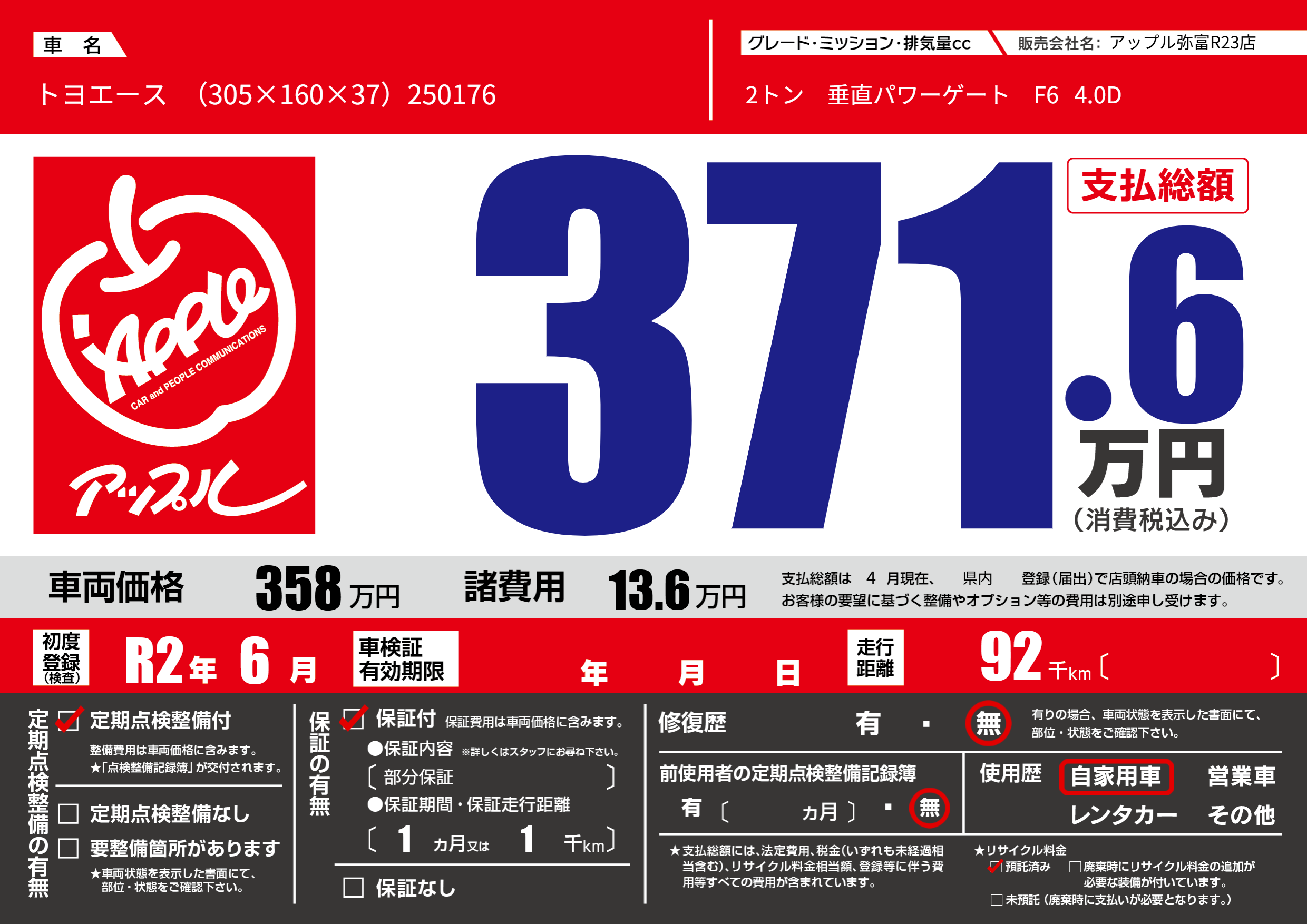 | 走行キロ | 9.2万km | 初年度登録 | R2年6月 |