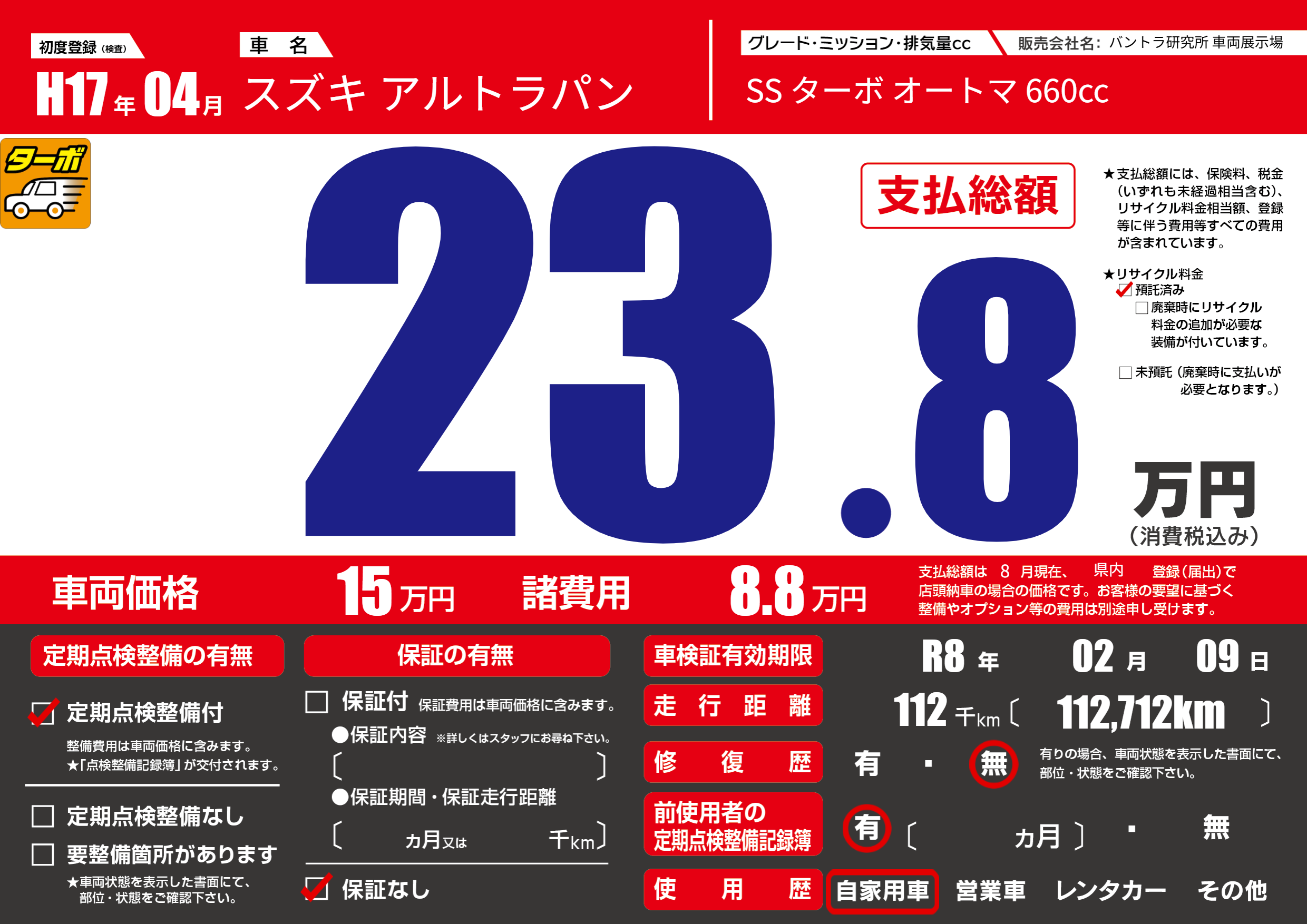 | 走行キロ | 11.2万km | 初年度登録 | H17年04月 |