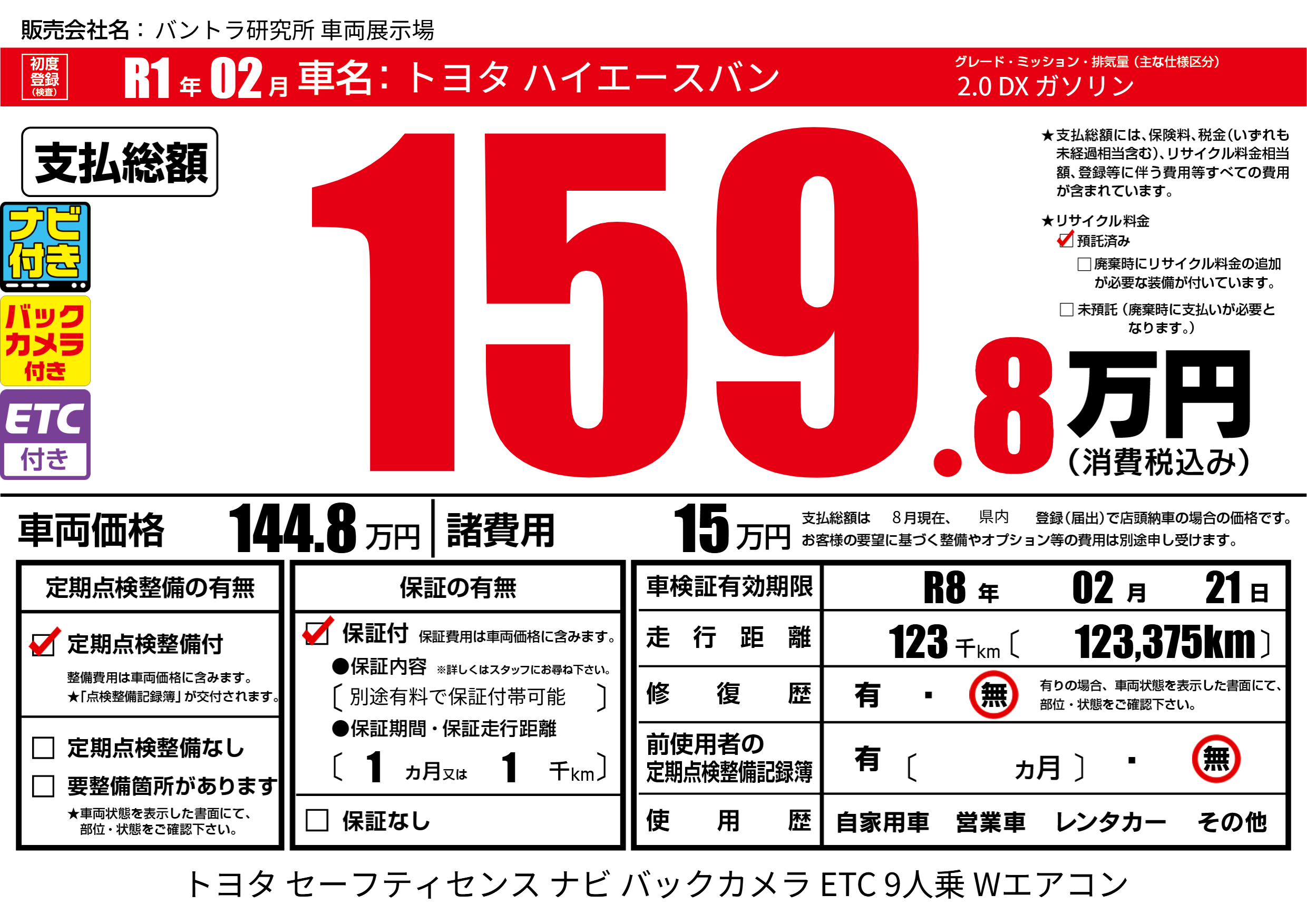 | 車名 | トヨタ ハイエースバン | グレード ミッション 排気量 |