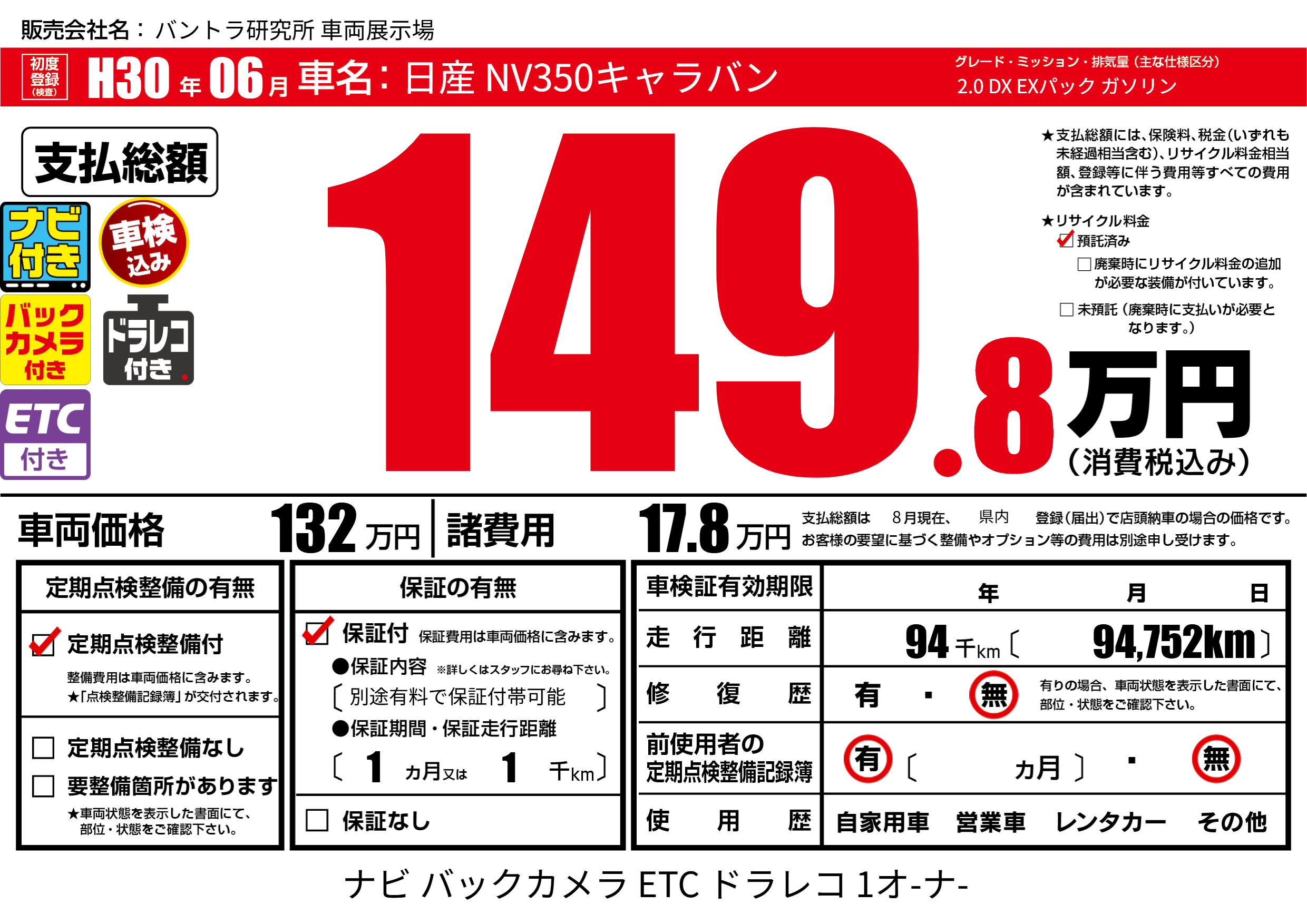 | 車名 | 日産 NV350キャラバン | グレード ミッション 排気量 |