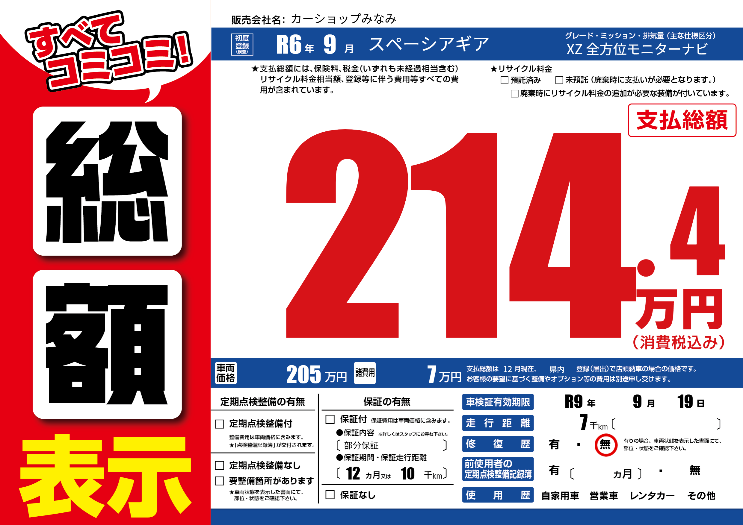 | 走行キロ | 0.7万km | 初年度登録 | R6年9月 |