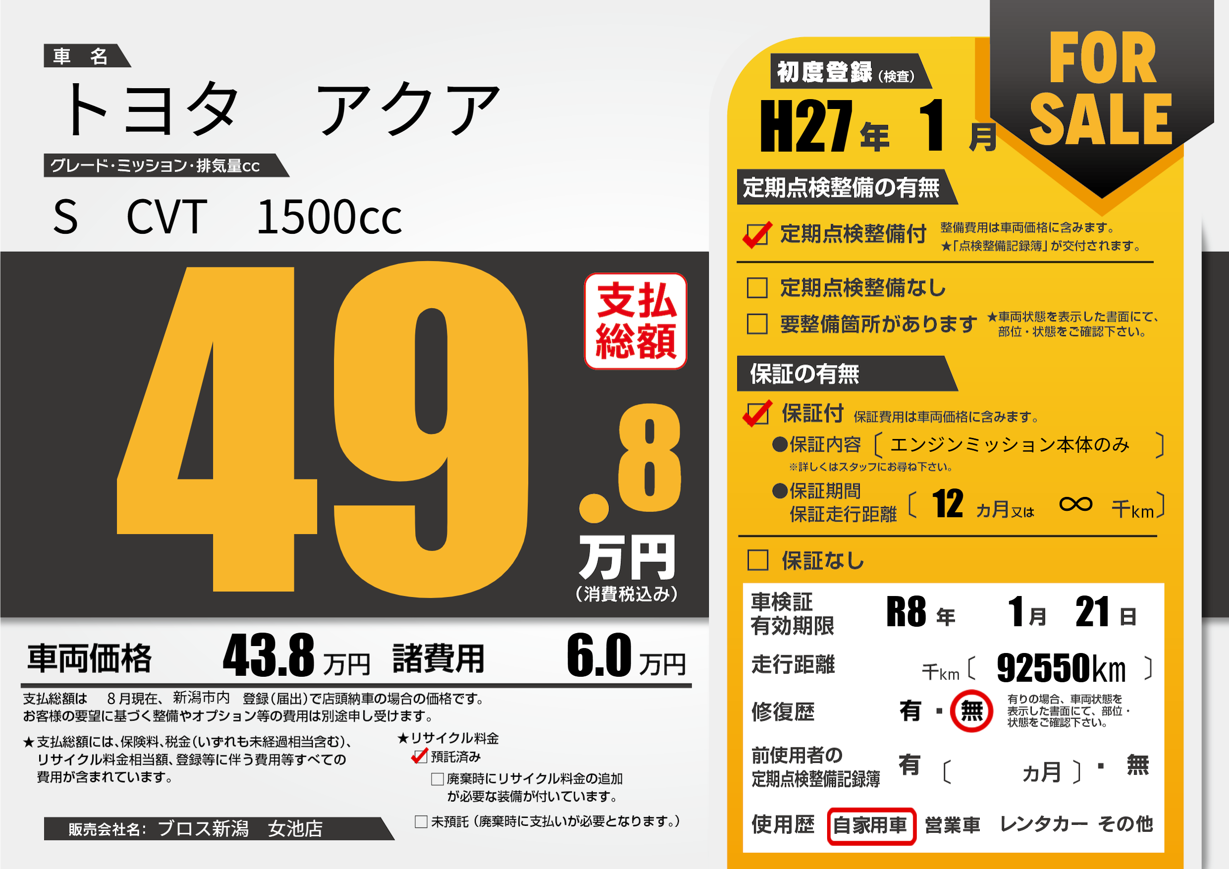 | 車名 | トヨタ アクア | グレード ミッション 排気量 |
