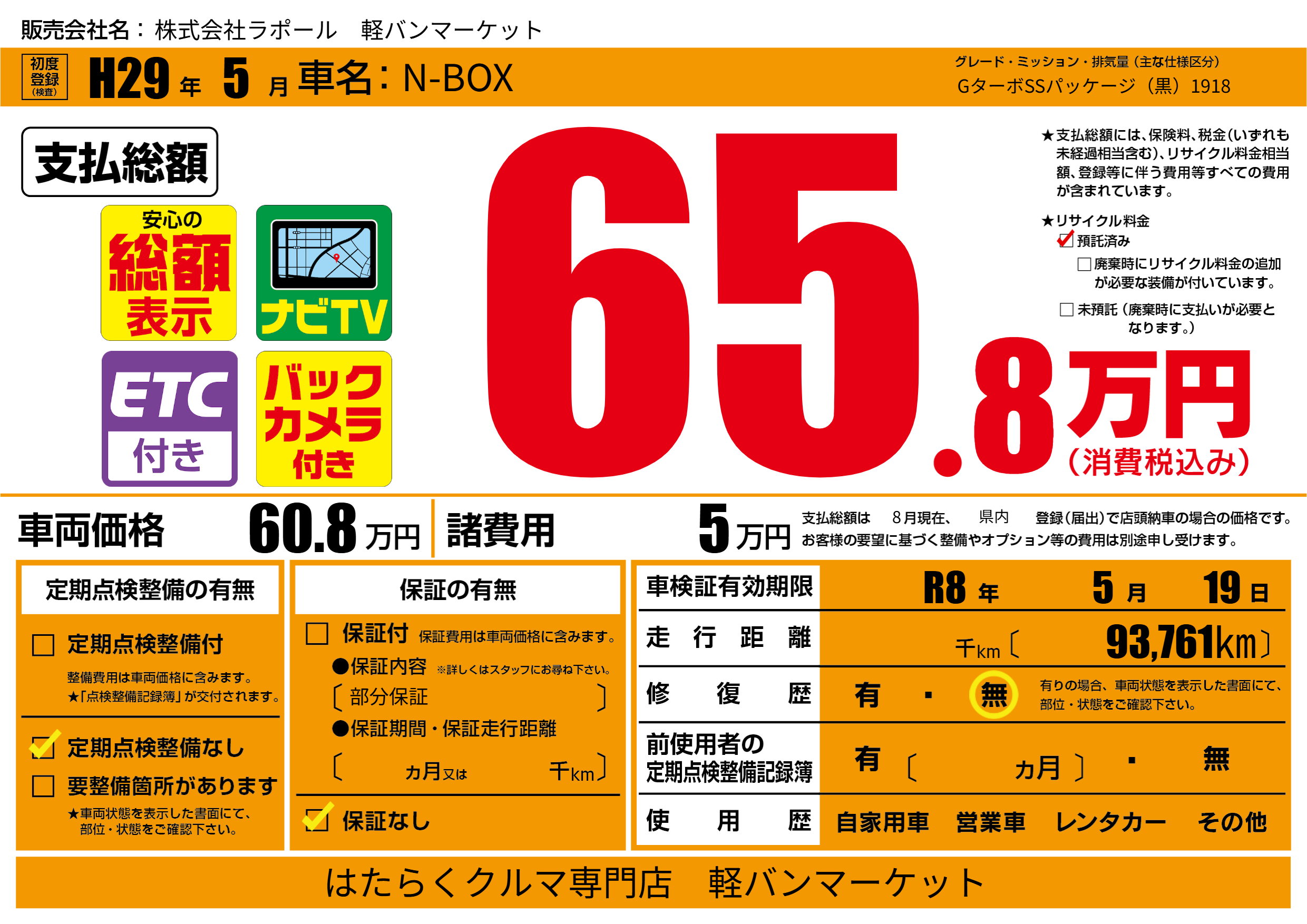 | 車名 | N-BOX | グレード ミッション 排気量 |