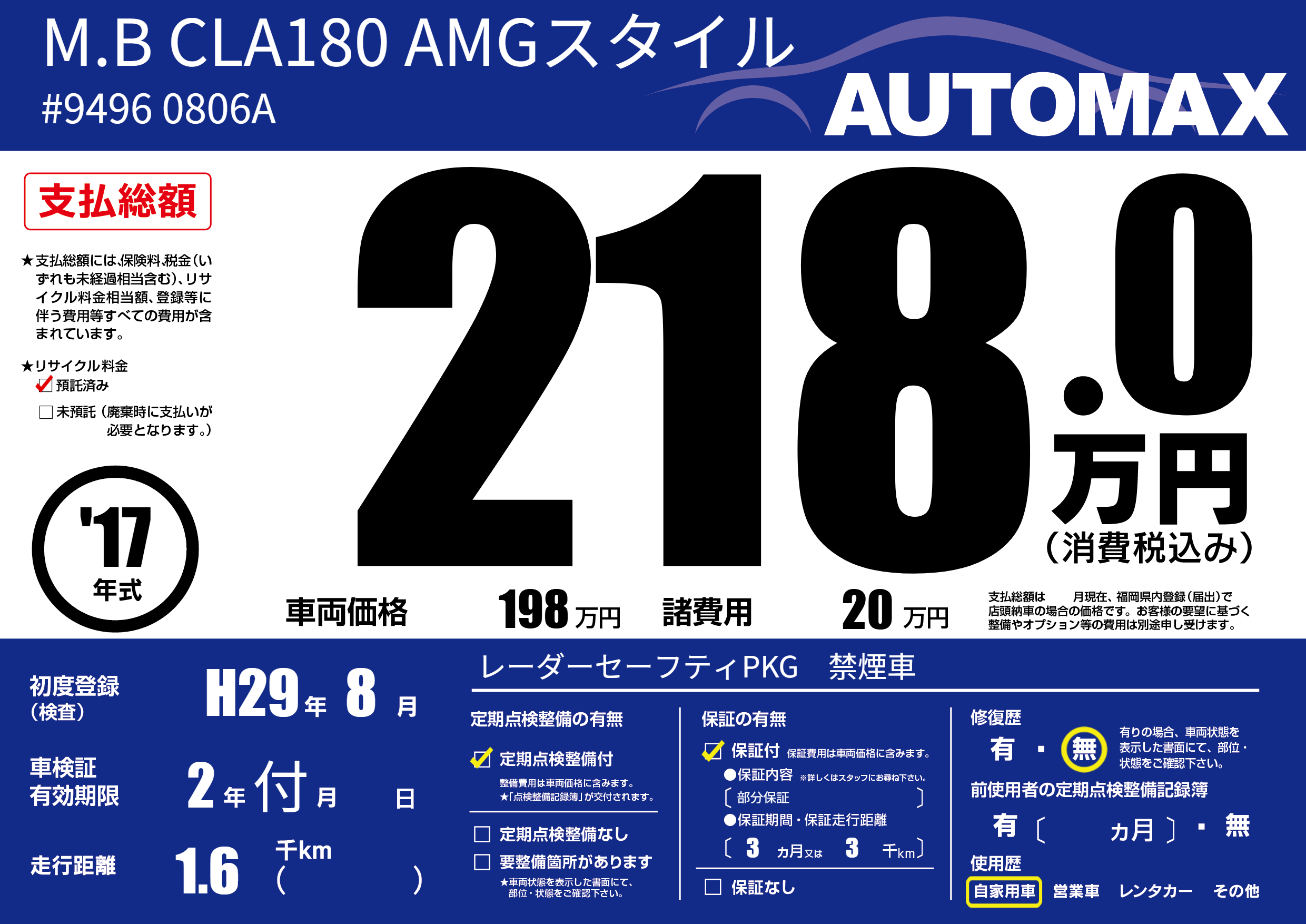 | 車名 | M.B CLA180 AMGスタイル | グレード ミッション 排気量 |