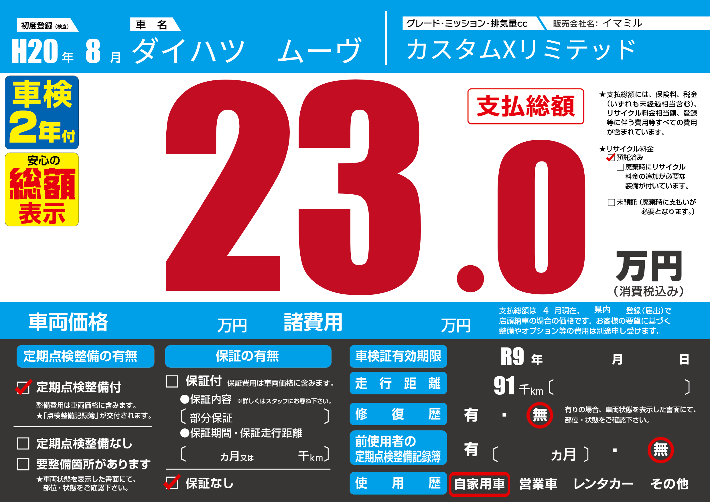 | 走行キロ | 9.1万km | 初年度登録 | H20年8月 |