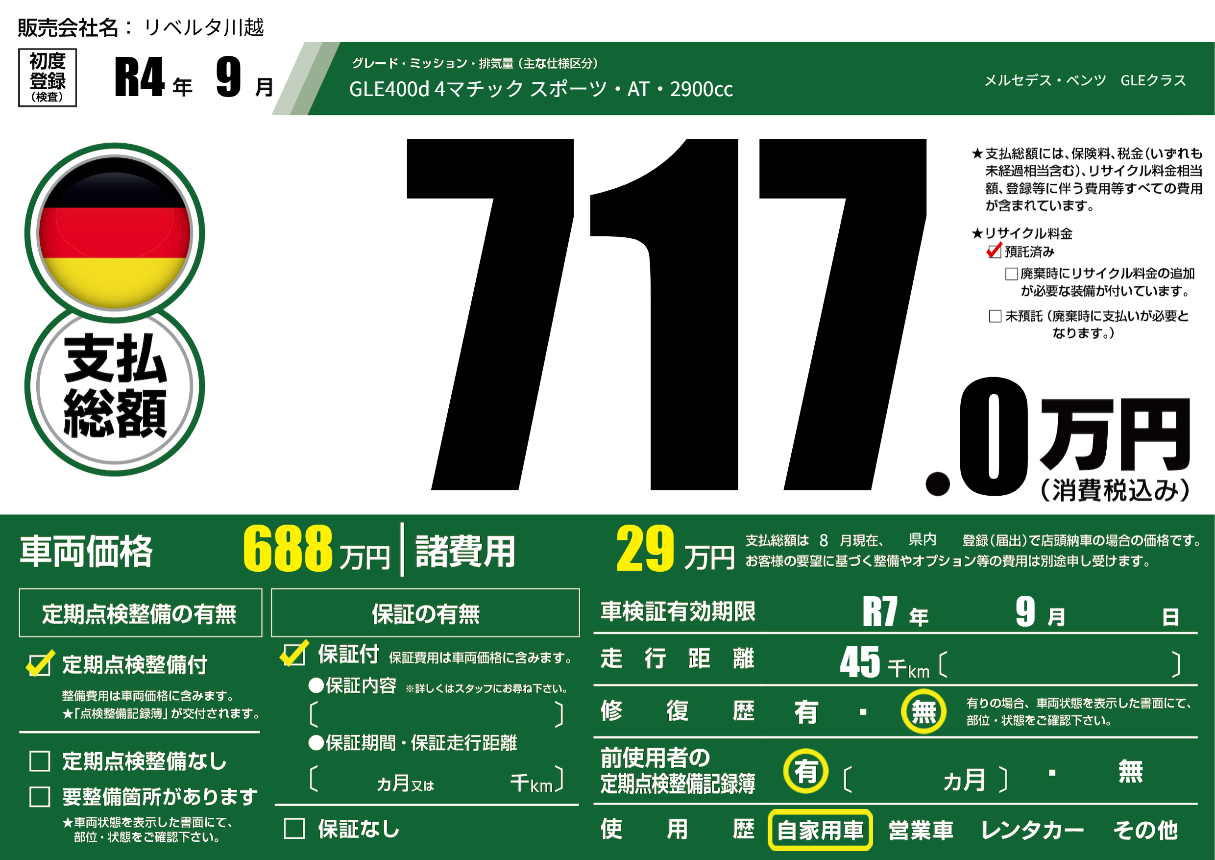 | 車名 | メルセデス・ベンツ GLEクラス | グレード ミッション 排気量 |