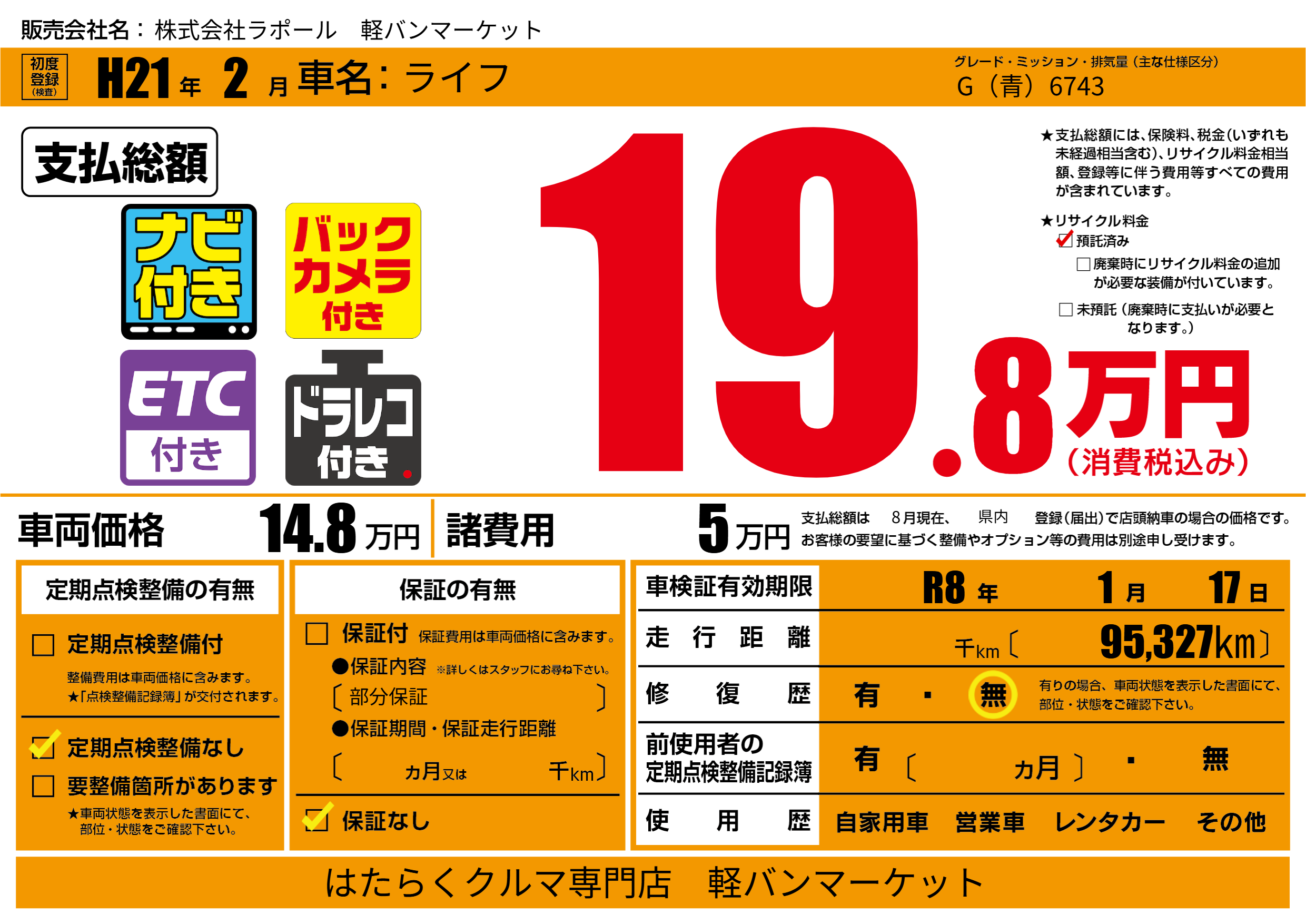 | 車名 | ライフ | グレード ミッション 排気量 |