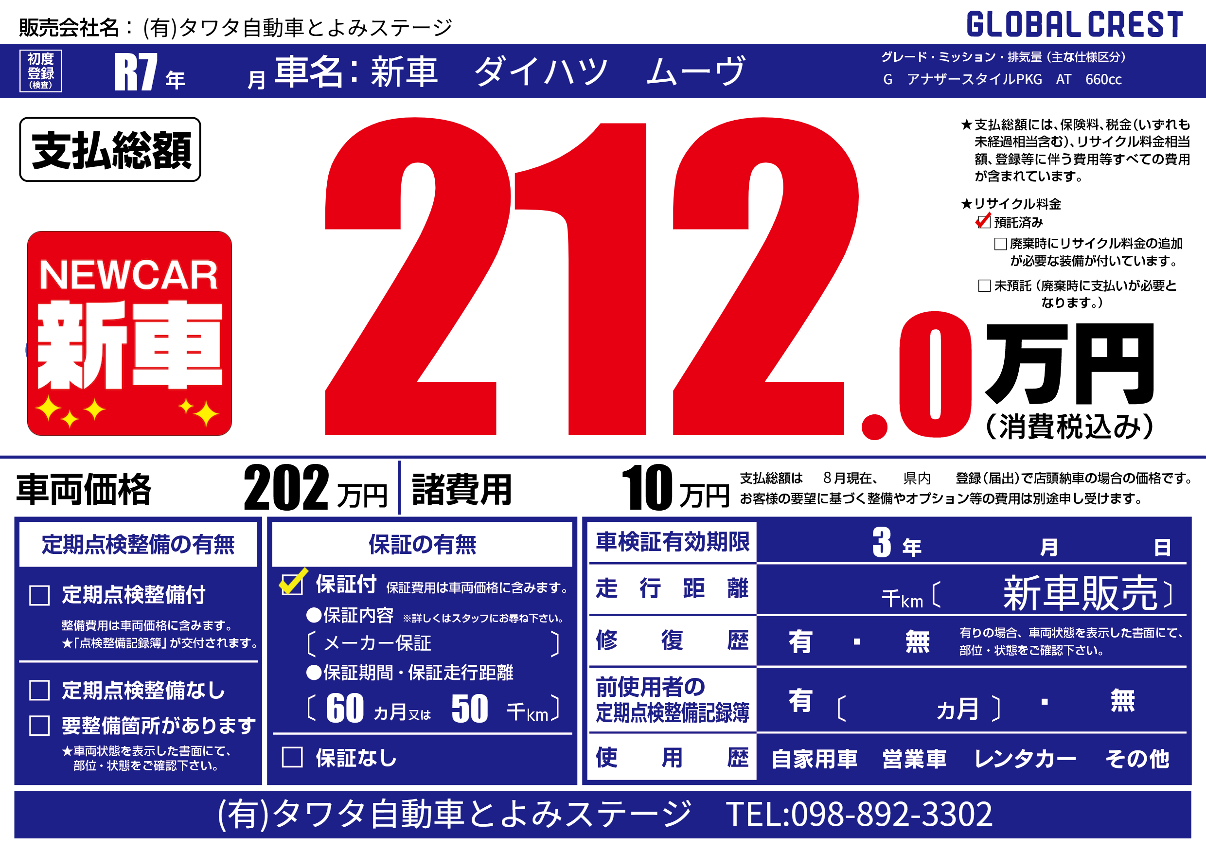 | 車名 | 新車 ダイハツ ムーヴ | グレード ミッション 排気量 |