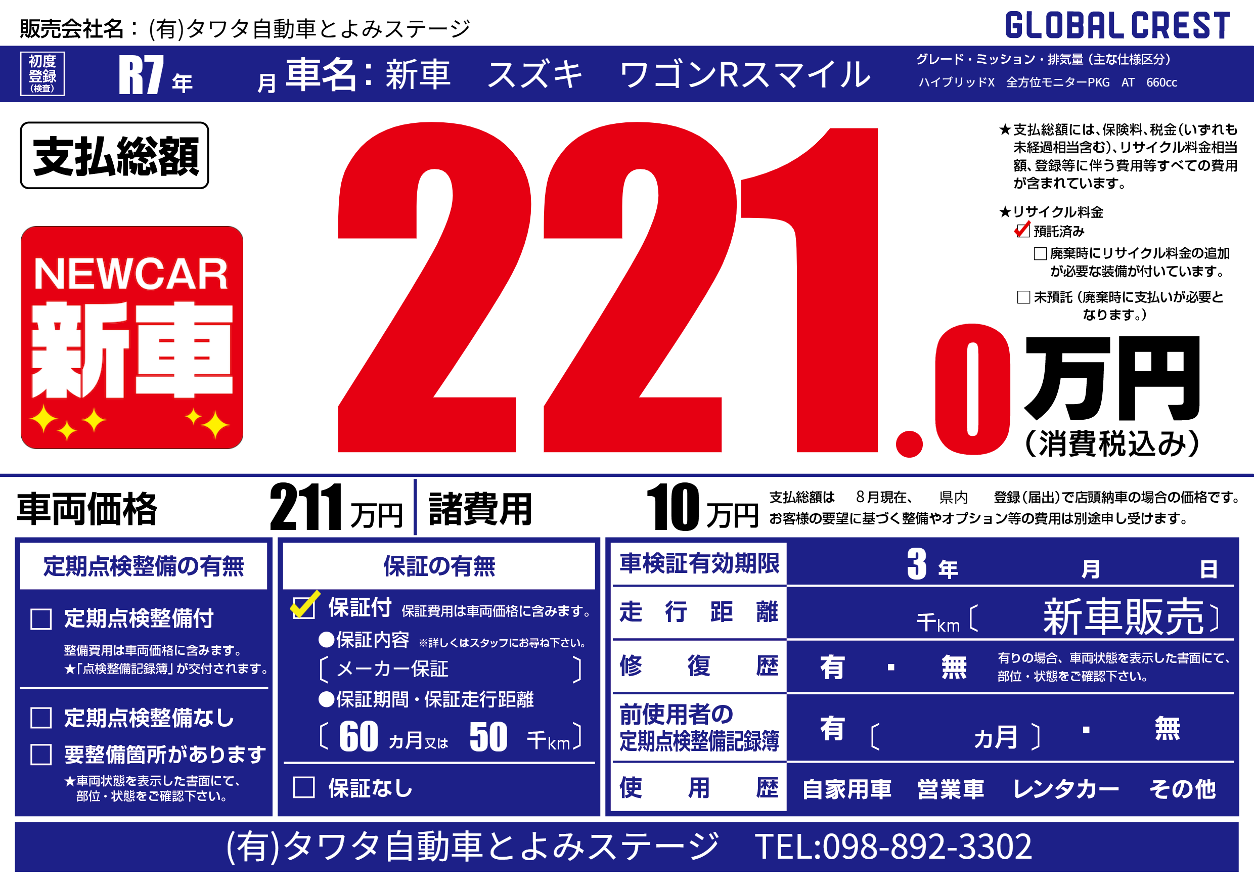 | 車名 | 新車 スズキ ワゴンRスマイル | グレード ミッション 排気量 |