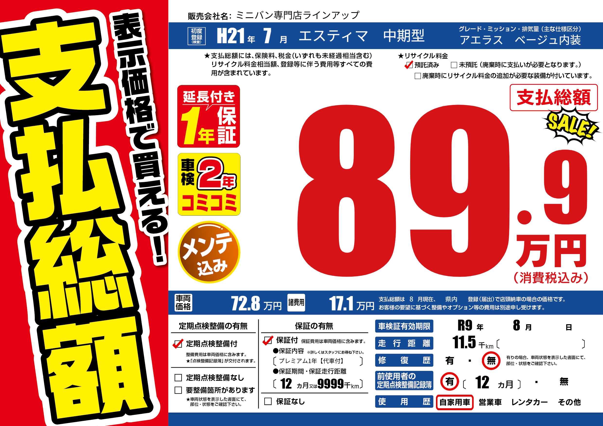 | 車名 | エスティマ 中期型 | グレード ミッション 排気量 |