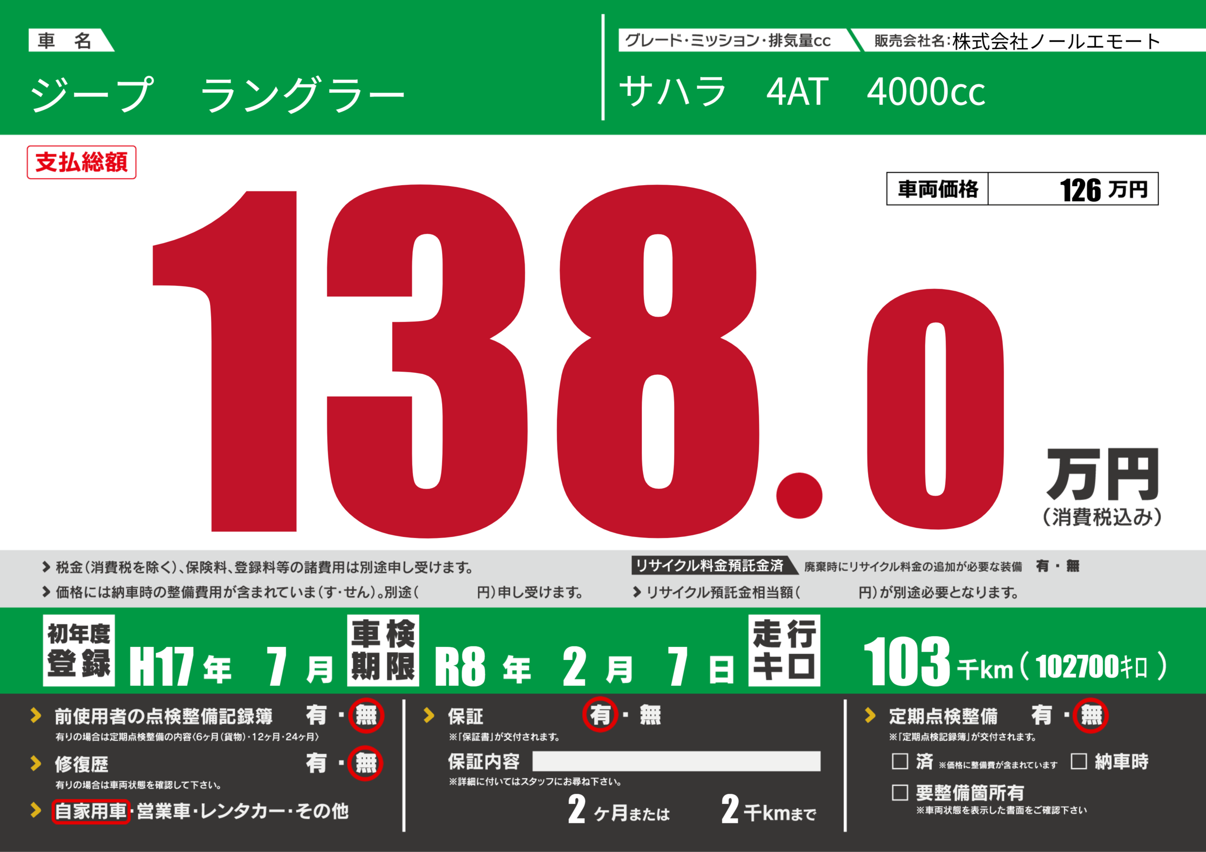保証付き 保証内容(---) 2ヶ月または(2)千kmまで |