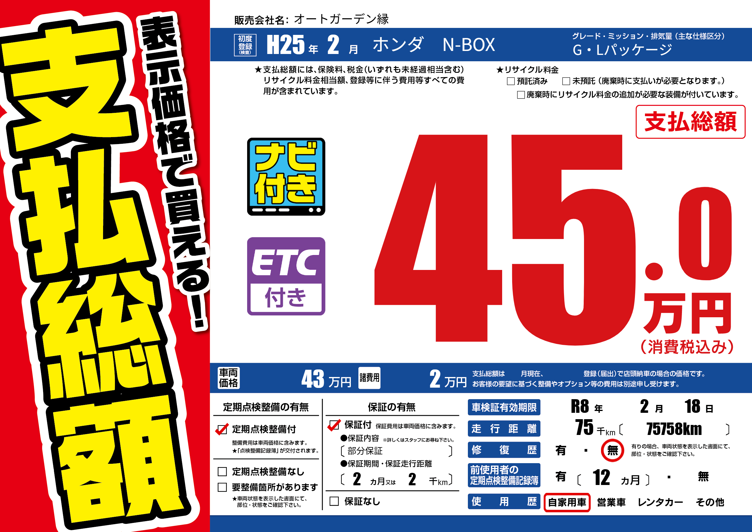 | 車名 | ホンダ N-BOX | グレード ミッション 排気量 |