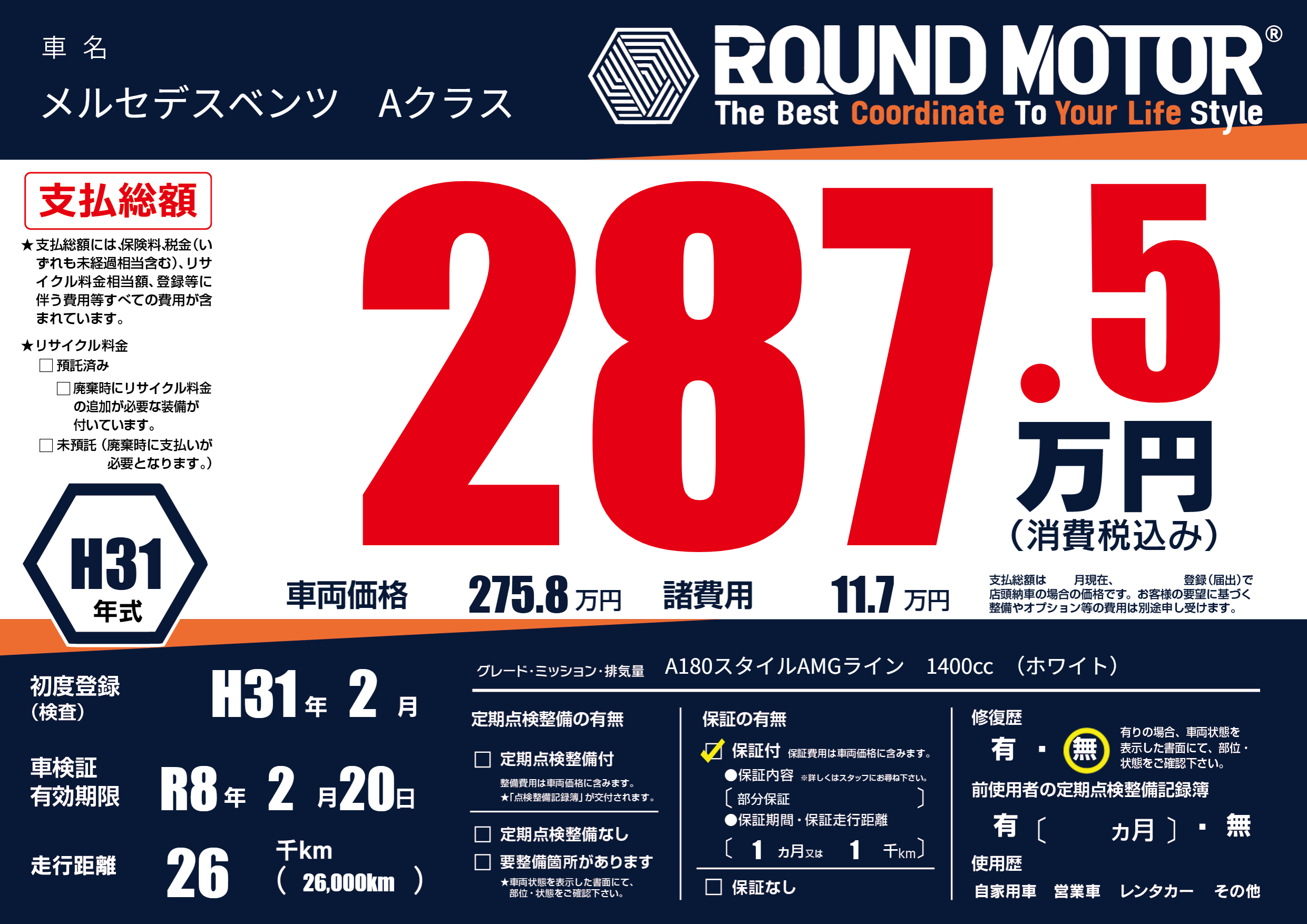 | 車名 | メルセデスベンツ Aクラス | グレード ミッション 排気量 |